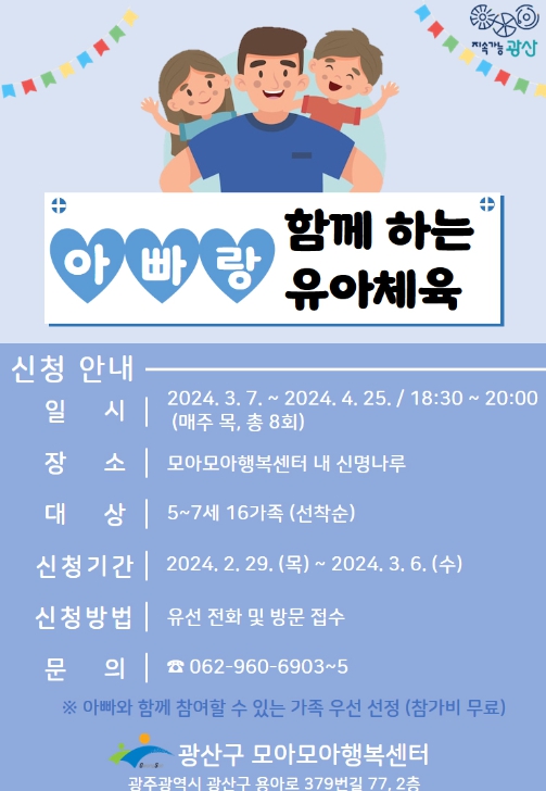 home 맘편한 내★일, 광주아이키움2.0 결혼·임신·출생 영유아 초·중·고 다양한 가족 일생활균형 커뮤니티 아동돌봄지원 소통방 나눔방 광주 아이키움 상담방 돌봄정보방 성폭력 피해 상담 및 사건지원 공지사항 우리동네 돌봄정보 기관별 공지사항 [광산구] 아빠랑 함께하는 유아체육 등록일 : 2024-02-28 17:00 카테고리 : 카테고리 없음 작성자 : 운영자 조회수 : 256 광산구모아모아행복센터에서부모와 함께하는 프로그램 참여자를 모집합니다.<출처:광산구청 블로그>https://blog.naver.com/gwangsan242/223366643492 목록