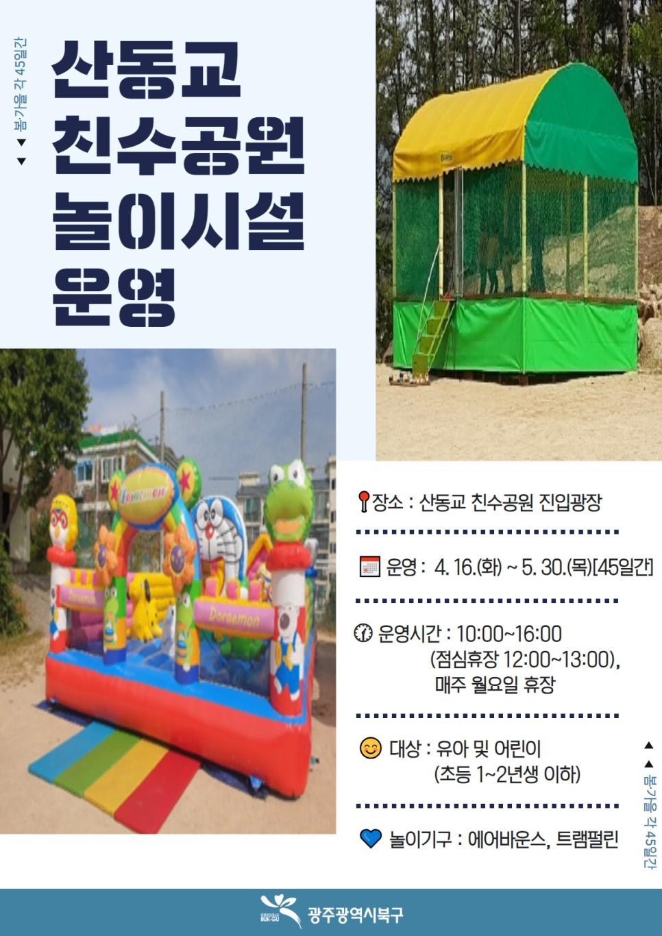 home 맘편한 내★일, 광주아이키움2.0 결혼·임신·출생 영유아 초·중·고 다양한 가족 일생활균형 커뮤니티 아동돌봄지원 소통방 나눔방 광주 아이키움 상담방 돌봄정보방 성폭력 피해 상담 및 사건지원 공지사항 우리동네 돌봄정보 기관별 공지사항 북구 산동교 친수공원 놀이시설 운영! 등록일 : 2024-04-17 11:05 카테고리 : 카테고리 없음 작성자 : 운영자 조회수 : 223 산동교 친구공원에서 놀이시설 운영을 합니다~○기간 : 4.16 ~ 5.30 (45일간) ○시간 : 10:00~16:00 / 매주 월요일 휴장, 12-13시 점심휴장 ○장소 : 산동교 친구공원 내 진입광장 (북구 동림동 138-2번지)○대상 : 유아 및 어린이(초등 1~2년생 이하)○이용료 : 무료○문의 : 062-410-6793 북구청 하천방재과 [출처 : 광주북구청] 목록
