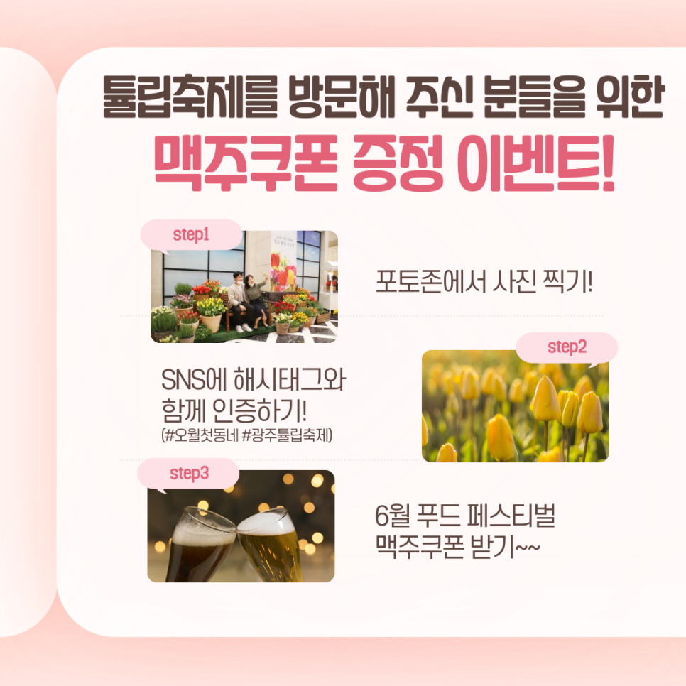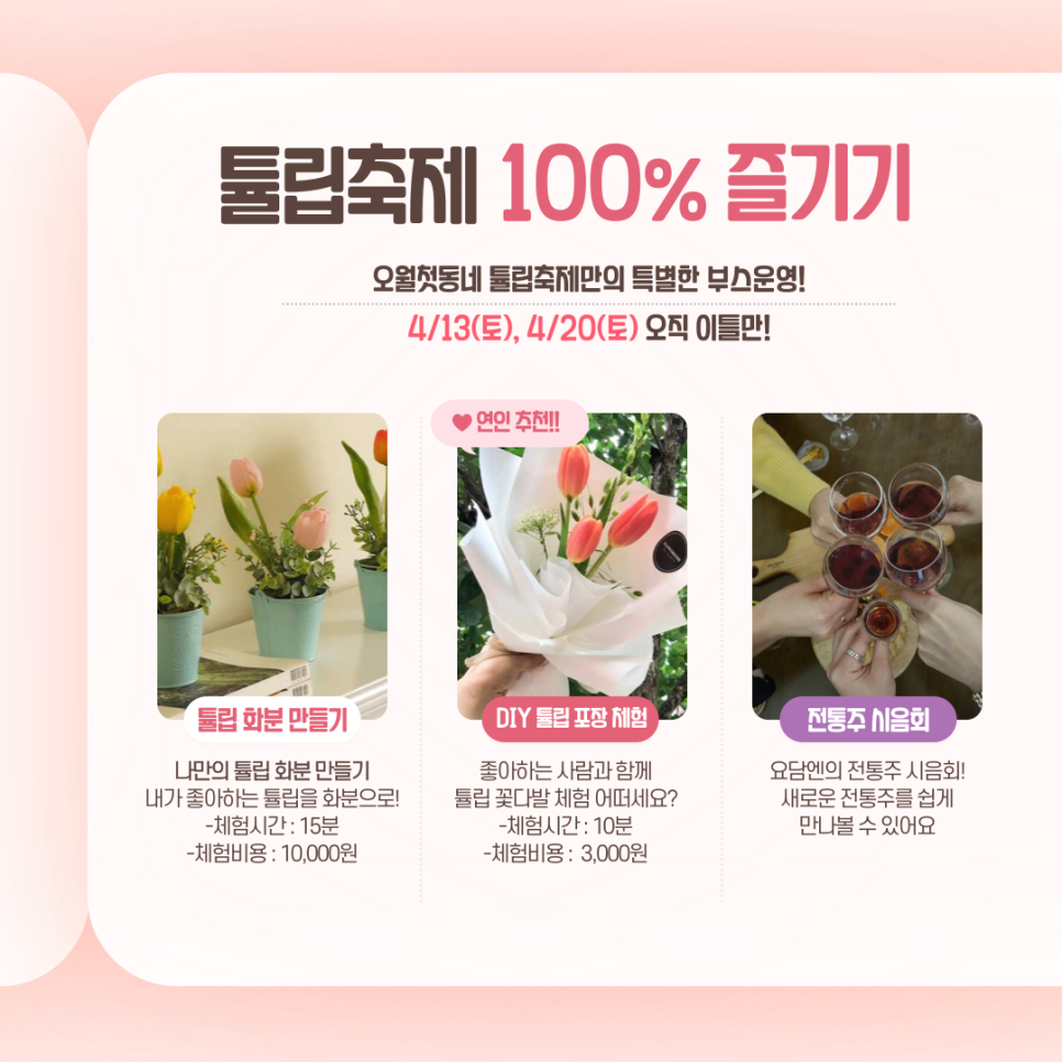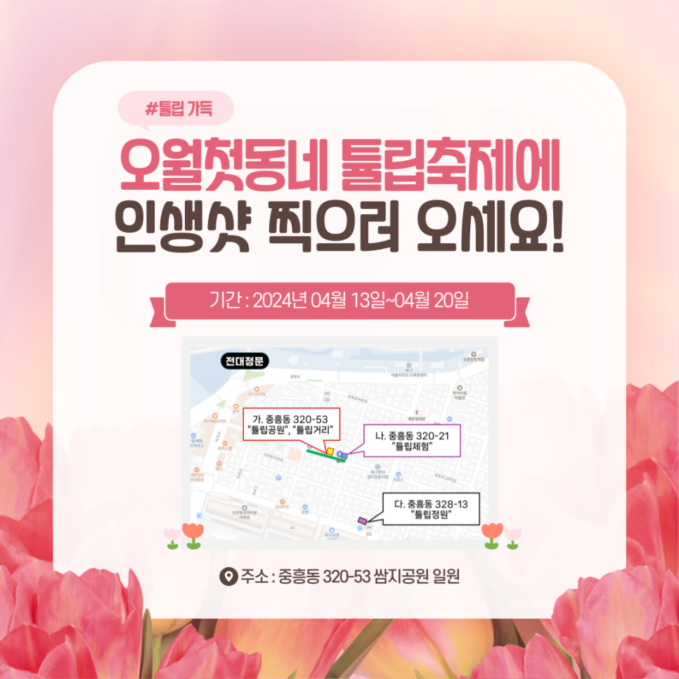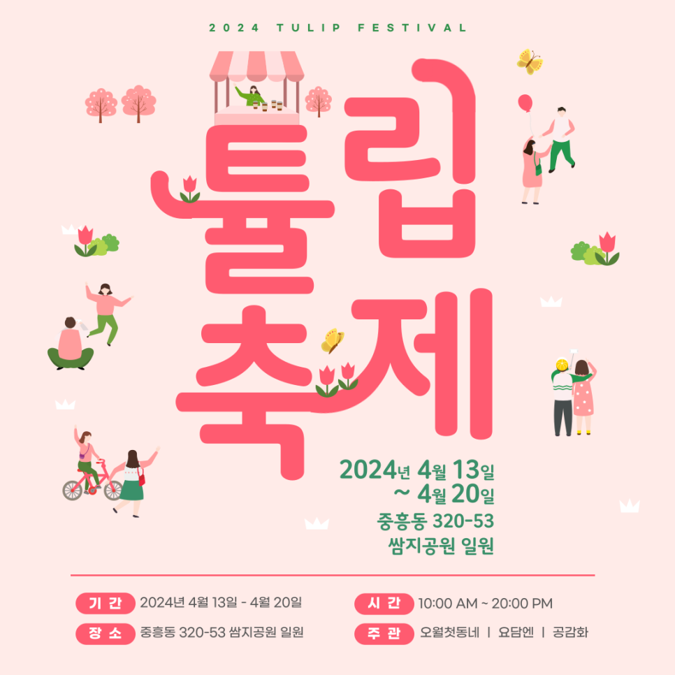 home 맘편한 내★일, 광주아이키움2.0 결혼·임신·출생 영유아 초·중·고 다양한 가족 일생활균형 커뮤니티 아동돌봄지원 소통방 나눔방 광주 아이키움 상담방 돌봄정보방 성폭력 피해 상담 및 사건지원 공지사항 우리동네 돌봄정보 기관별 공지사항 [오월첫동네] 2024 튤립축제🌷 등록일 : 2024-04-18 10:01 카테고리 : 카테고리 없음 작성자 : 운영자 조회수 : 255 [행사 안내]💗기간2024. 4. 13 (토) ~ 4. 20 (토)10:00 ~ 20:00💗장소광주 북구 중흥동 320-53쌈지공원 일원💗체험부스1) 튤립화분 만들기2) DIY 튤립 포장체험3) 전통주 시음회<출처> 오월첫동네 목록