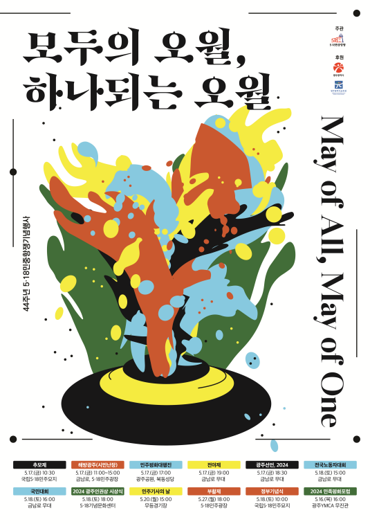 [행사 안내] 🔸5·18 추모제 05.17.(금) 10:30 / 국립 5·18민주묘지 🔸해방광주(시민난장) 05.17.(금) ~ 18.(토) 11:00 금남로, 5·18민주광장 🔸5·18 민주평화대행진 05.17.(금) 17:00 광주공원, 북동성당~금남로 🔸전야제 05.17.(금) 19:00 ~ 21:00 5·18민주광장, 금남로1~3가 🔸광주선언 2024 05.17.(금) 18:30 금남로 무대 🔸전국 노동자 대회 05.18.(토) 15:00 금남로 무대 🔸국민대회 05.18.(토) 16:00 금남로 무대 🔸2024 광주인권상 시상식 05.18.(토) 18:00 5·18 기념문화센터 🔸민주기사의 날 05.20.(월) 15:00 무등경기장 🔸부활제 05.27.(월) 18:00 5·18 민주광장 🔸정부기념식 05.18.(토) 10:00 국립5·18민주묘지 🔸2024 민족평화포럼 05.16.(목) 16:00 광주YMCA 무진관