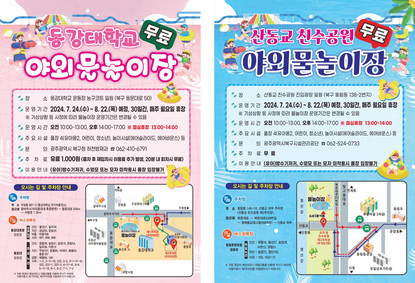 "동강대학교 운동장, 산동교 친수공원" 야외 물놀이장이 7월 24일부터 무료 개장하오니 주민 여러분의 많은 이용 바랍니다.