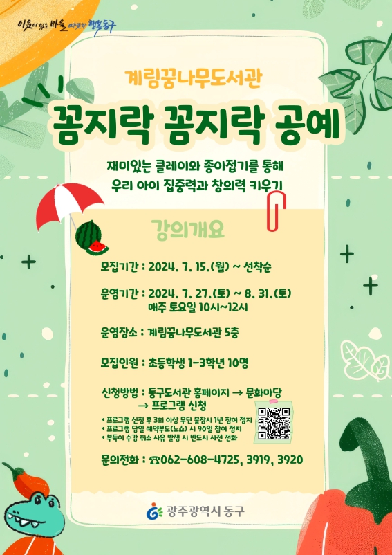 home 맘편한 내★일, 광주아이키움2.0 결혼·임신·출생 영유아 초·중·고 다양한 가족 일생활균형 커뮤니티 아동돌봄지원 소통방 나눔방 광주 아이키움 상담방 돌봄정보방 성폭력 피해 상담 및 사건지원 공지사항 우리동네 돌봄정보 기관별 공지사항 [계림꿈나무도서관] 꼼지락 꼼지락 공예 등록일 : 2024-07-24 09:25 카테고리 : 카테고리 없음 작성자 : 운영자 조회수 : 145 [프로그램 안내]🔸모집 기간2024.07.15.(월) ~ 선착순🔸운영 기간2024.07.27.(토) ~ 08.31.(토)매주 토요일 10:00 ~ 12:00🔸운영 장소계림꿈나무도서관 5층🔸모집 인원초등학생 1-3학년 10명🔸신청 방법동구도서관 홈페이지 > 문화마당 > 프로그램 신청🔸문의062-608-4725,3919,3920<출처> 광주광역시 동구 목록