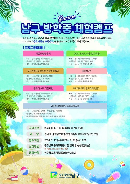 home 맘편한 내★일, 광주아이키움2.0 결혼·임신·출생 영유아 초·중·고 다양한 가족 일생활균형 커뮤니티 아동돌봄지원 소통방 나눔방 광주 아이키움 상담방 돌봄정보방 성폭력 피해 상담 및 사건지원 공지사항 우리동네 돌봄정보 기관별 공지사항 [남구] 여름방학 체험캠프 등록일 : 2024-07-25 11:00 카테고리 : 카테고리 없음 작성자 : 운영자 조회수 : 144 [출처:남구청] 목록