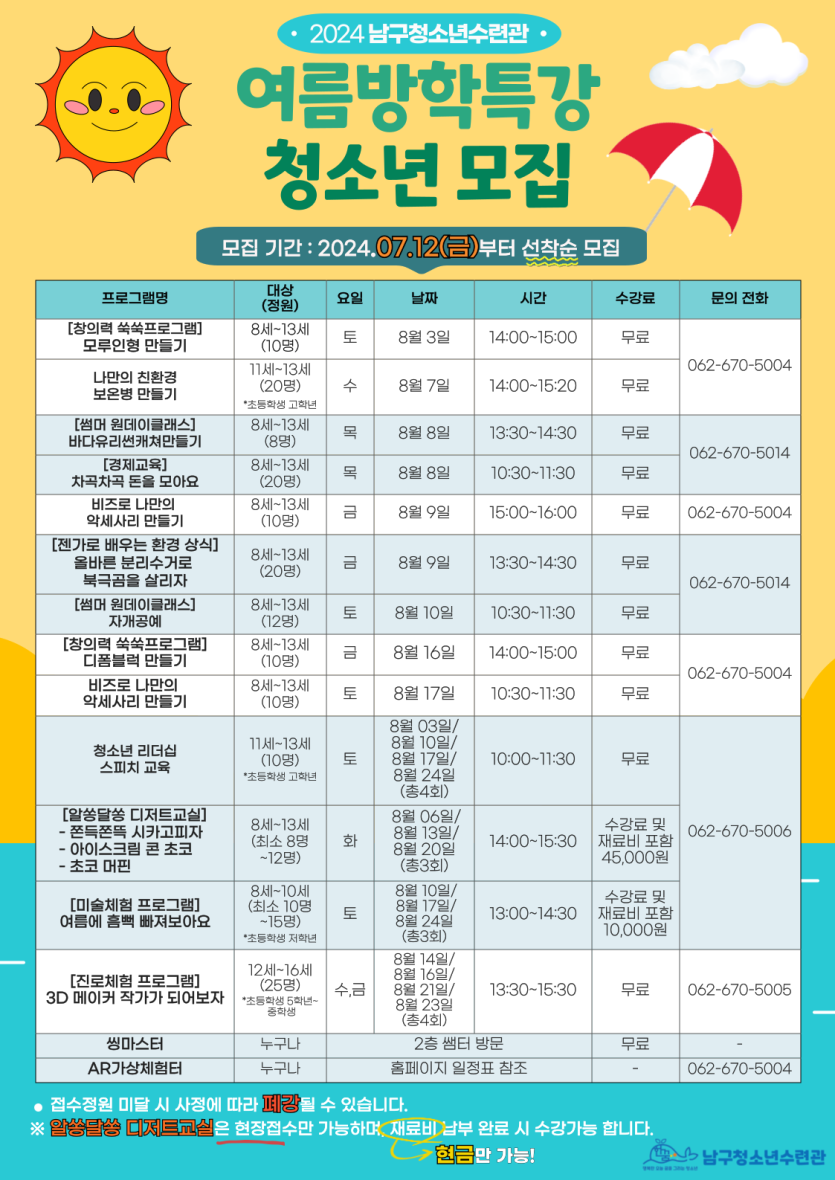 home 맘편한 내★일, 광주아이키움2.0 결혼·임신·출생 영유아 초·중·고 다양한 가족 일생활균형 커뮤니티 아동돌봄지원 소통방 나눔방 광주 아이키움 상담방 돌봄정보방 성폭력 피해 상담 및 사건지원 공지사항 우리동네 돌봄정보 기관별 공지사항 [남구청소년수련관]여름방학 특강 등록일 : 2024-07-31 09:31 카테고리 : 카테고리 없음 작성자 : 운영자 조회수 : 163 [출처 : 남구청소년수련관] 목록