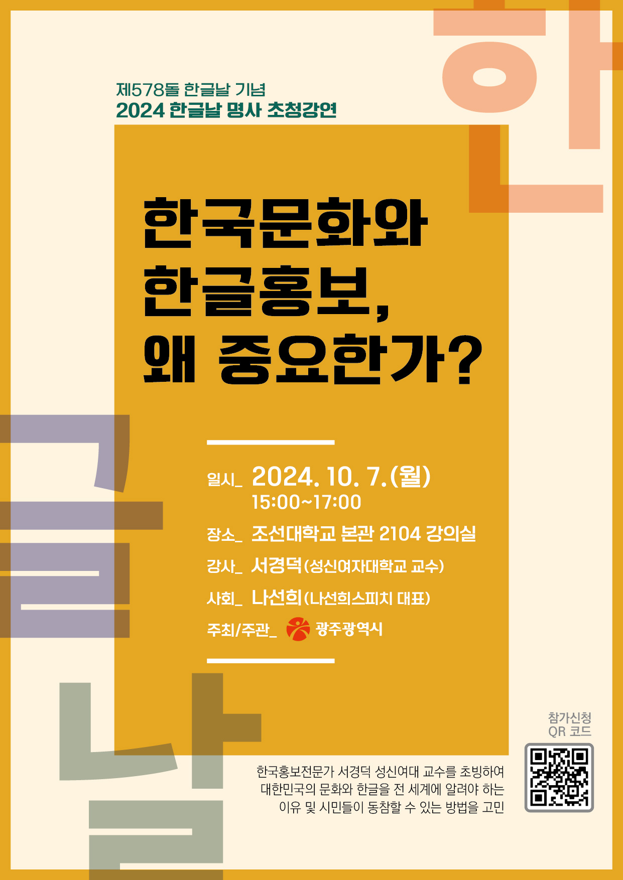 제578돌 한글날을 맞아 오는 7일 오후 3시 조선대학교 본관 2104호에서 ‘2024 한글날 명사 초청 강연’을 개최한다.
