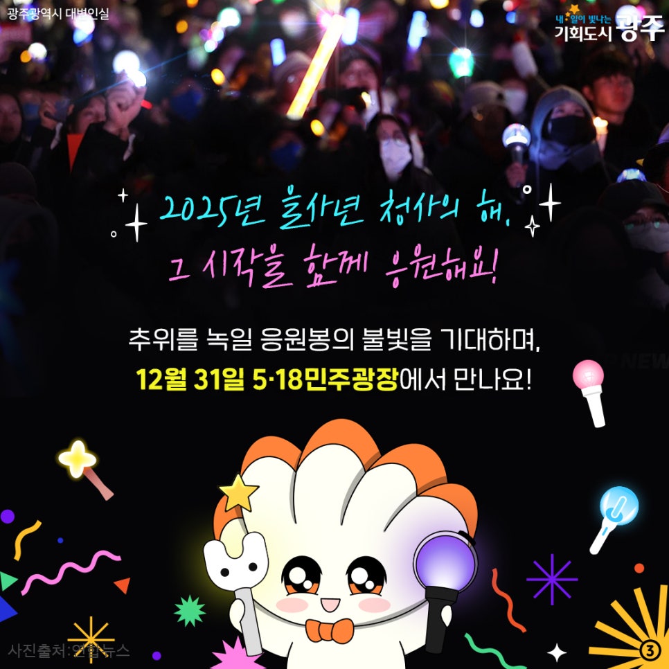 home 맘편한 내★일, 광주아이키움2.0 결혼·임신·출생 영유아 초·중·고 다양한 가족 일생활균형 커뮤니티 아동돌봄지원 소통방 나눔방 광주 아이키움 상담방 돌봄정보방 성폭력 피해 상담 및 사건지원 공지사항 우리동네 돌봄정보 기관별 공지사항 2024년 마지막과 2025년의 시작, 응원봉을 들고 만나요~ 등록일 : 2024-12-27 13:40 카테고리 : 카테고리 없음 작성자 : 운영자 조회수 : 279 2024년 마지막과 2025년의 시작,응원봉을 들고 만나요~광주광역시가 시민과 함께하는송·신년 행사를 마련했습니다.5·18민주광장에서 새해맞이 함께해요![출처] 시민과 함께하는 광주광역시 송·신년 행사 '한강의 꿈, 광주의 빛'|작성자 광주광역시 목록