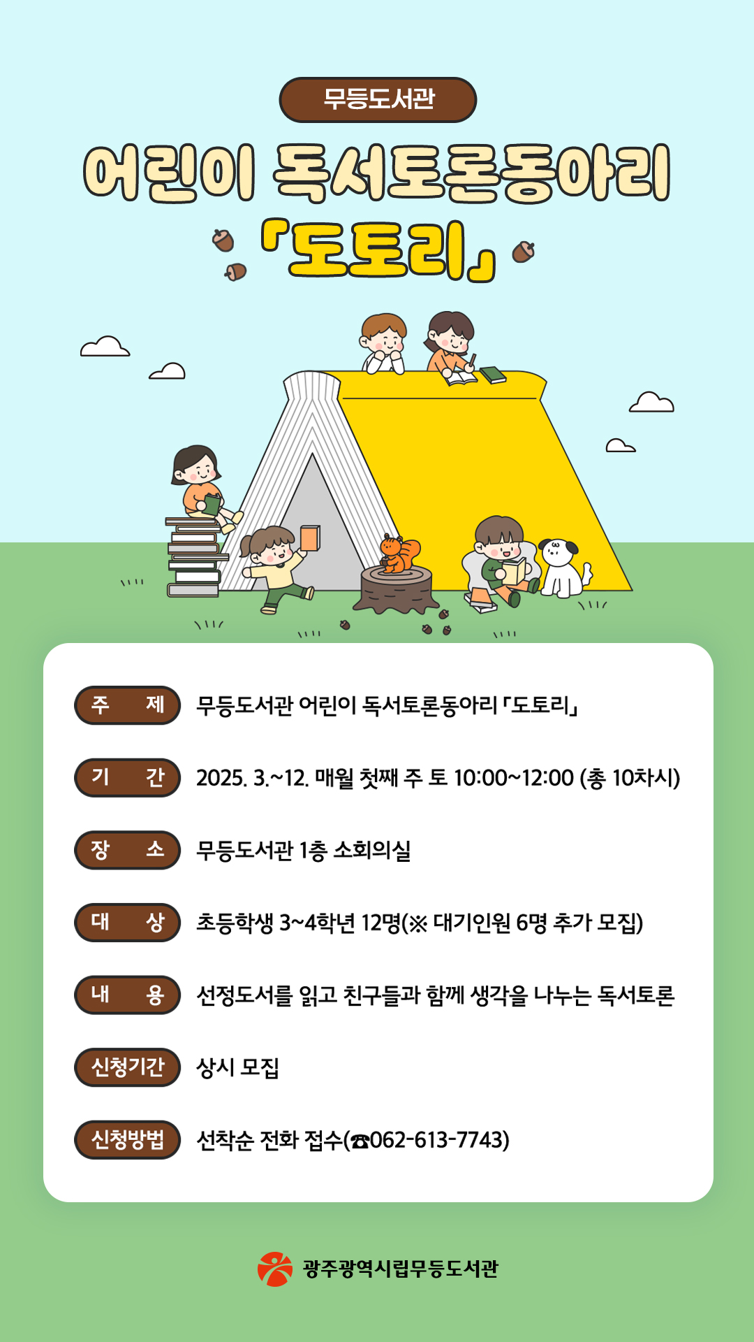 home 맘편한 내★일, 광주아이키움2.0 결혼·임신·출생 영유아 초·중·고 다양한 가족 일생활균형 커뮤니티 아동돌봄지원 소통방 나눔방 광주 아이키움 상담방 돌봄정보방 성폭력 피해 상담 및 사건지원 공지사항 우리동네 돌봄정보 기관별 공지사항 [무등도서관] 어린이 독서토론동아리 '도토리' 모집 등록일 : 2025-01-31 10:49 카테고리 : 카테고리 없음 작성자 : 운영자 조회수 : 110 신청 바로가기: https://citylib.gwangju.kr/main/clturReq/1/read/985 목록