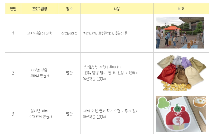 home 맘편한 내★일, 광주아이키움2.0 결혼·임신·출생 영유아 초·중·고 다양한 가족 일생활균형 커뮤니티 아동돌봄지원 소통방 나눔방 광주 아이키움 상담방 돌봄정보방 성폭력 피해 상담 및 사건지원 공지사항 우리동네 돌봄정보 기관별 공지사항 [남도향토음식박물관] 정월대보름이랑께🌕 등록일 : 2025-02-12 09:11 카테고리 : 카테고리 없음 작성자 : 운영자 조회수 : 96 오늘은 2025년 올 해 첫 보름달이 뜨는 날! 정월대보름입니다!새해의 풍년과 안녕을 기원하기위해 남도향토음식박물관에서다채로운 프로그램을 진행한다고해요~남도향토음식박물관과 함께하는 정월대보름이랑께🌕[출처] 남도향토음식박물관과 함께하는 정월대보름이랑께🌕|작성자 광주광역시북구 목록