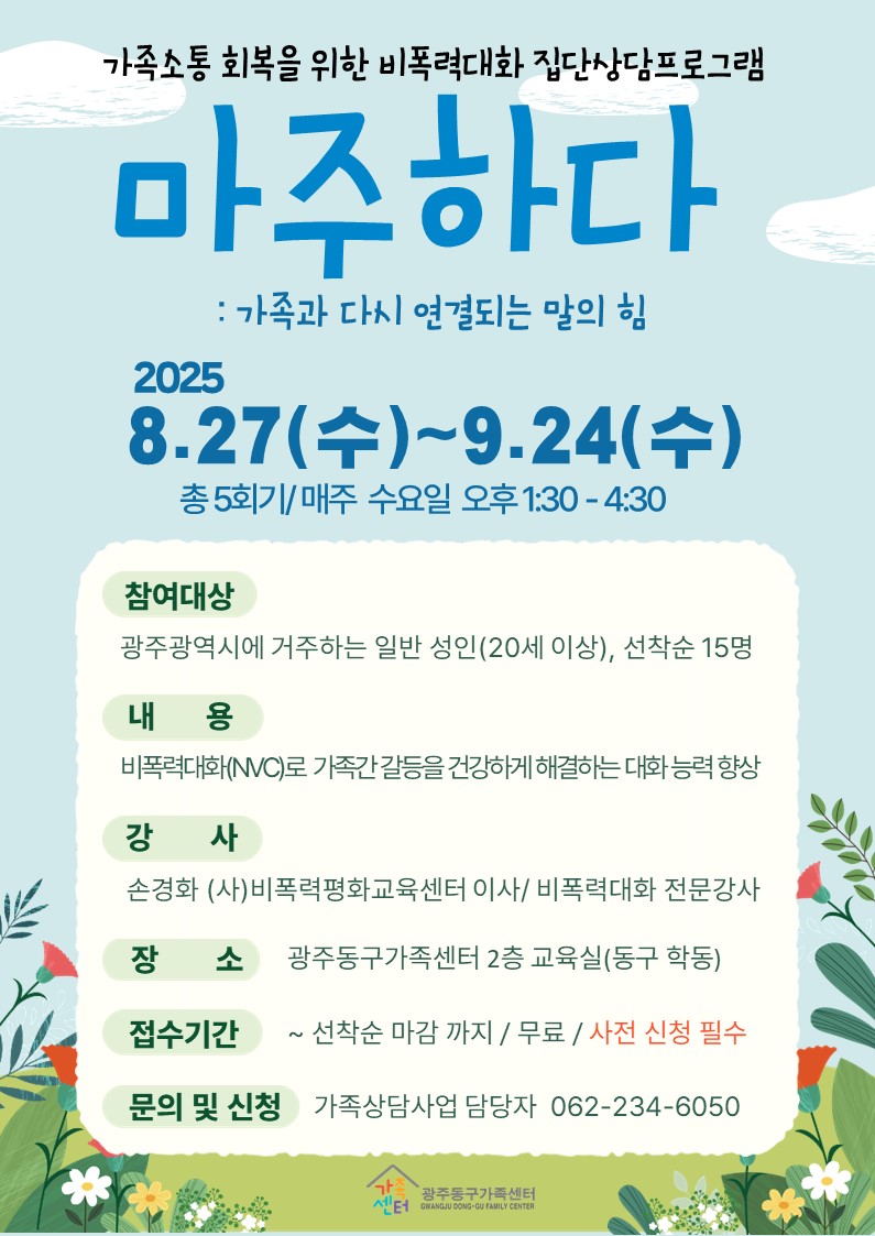 home 맘편한 내★일, 광주아이키움2.0 결혼·임신·출생 영유아 초·중·고 다양한 가족 일생활균형 커뮤니티 아동돌봄지원 소통방 나눔방 광주 아이키움 상담방 돌봄정보방 성폭력 피해 상담 및 사건지원 공지사항 우리동네 돌봄정보 기관별 공지사항 [광주 동구 가족센터] 비폭력대화 집단상담프로그램 등록일 : 2025-08-08 14:15 카테고리 : 카테고리 없음 작성자 : 운영자 조회수 : 45 [출처 : 광주동구가족센터] 목록