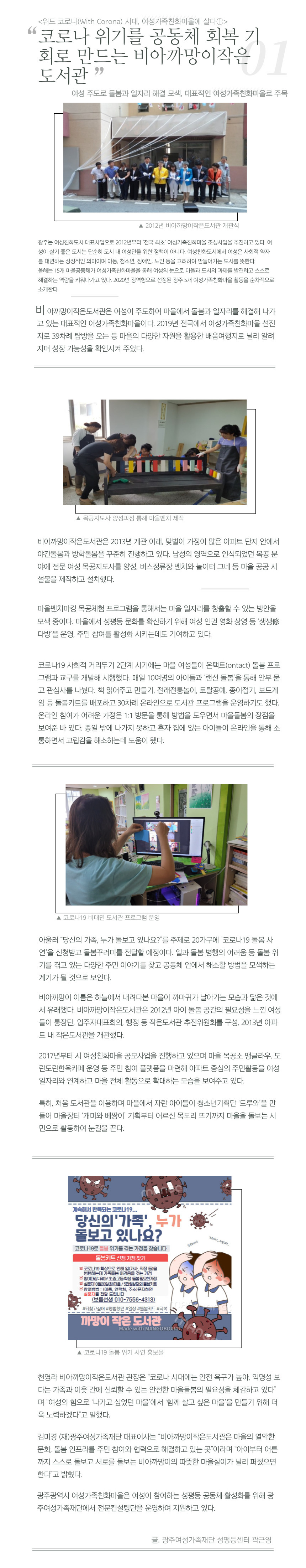 home 맘편한 내★일, 광주아이키움2.0 결혼·임신·출생 영유아 초·중·고 다양한 가족 일생활균형 커뮤니티 아동돌봄지원 소통방 나눔방 광주 아이키움 상담방 돌봄정보방 성폭력 피해 상담 및 사건지원 공지사항 우리동네 돌봄정보 기관별 공지사항 <위드 코로나(with Corona)시대, 여성가족친화마을에 살다 1> "코로나 위기를 공동체 회복 기회로 만드는 비아까망이작은도서관" 등록일 : 2021-03-23 15:24 카테고리 : 카테고리 없음 작성자 : 운영자 조회수 : 775 목록