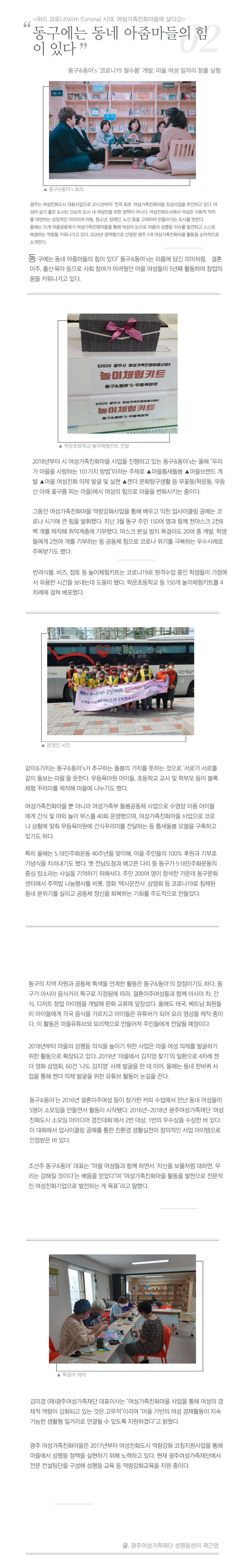 home 맘편한 내★일, 광주아이키움2.0 결혼·임신·출생 영유아 초·중·고 다양한 가족 일생활균형 커뮤니티 아동돌봄지원 소통방 나눔방 광주 아이키움 상담방 돌봄정보방 성폭력 피해 상담 및 사건지원 공지사항 우리동네 돌봄정보 기관별 공지사항 <위드 코로나(with Corona)시대, 여성가족친화마을에 살다 2> "동구에는 동네 아줌마들의 힘이 있다" 등록일 : 2021-03-23 15:27 카테고리 : 카테고리 없음 작성자 : 운영자 조회수 : 773 목록