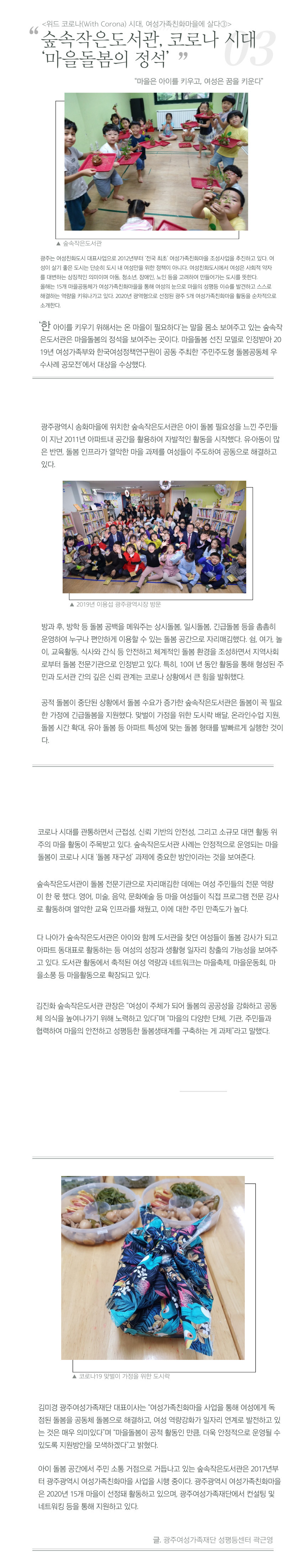 home 맘편한 내★일, 광주아이키움2.0 결혼·임신·출생 영유아 초·중·고 다양한 가족 일생활균형 커뮤니티 아동돌봄지원 소통방 나눔방 광주 아이키움 상담방 돌봄정보방 성폭력 피해 상담 및 사건지원 공지사항 우리동네 돌봄정보 기관별 공지사항 <위드 코로나(with Corona)시대, 여성가족친화마을에 살다 3> "숲속작은도서관, 코로나 시대 '마을돌봄의 정석'" 등록일 : 2021-03-23 15:29 카테고리 : 카테고리 없음 작성자 : 운영자 조회수 : 738 목록