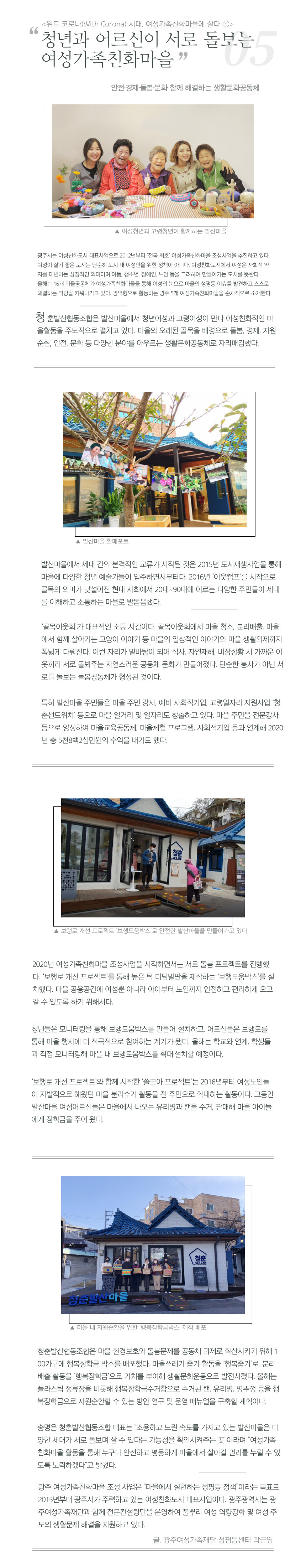 home 맘편한 내★일, 광주아이키움2.0 결혼·임신·출생 영유아 초·중·고 다양한 가족 일생활균형 커뮤니티 아동돌봄지원 소통방 나눔방 광주 아이키움 상담방 돌봄정보방 성폭력 피해 상담 및 사건지원 공지사항 우리동네 돌봄정보 기관별 공지사항 <위드 코로나(with Corona)시대, 여성가족친화마을에 살다 5> "청년과 어르신이 서로 돌보는 여성가족친화마을" 등록일 : 2021-03-23 15:31 카테고리 : 카테고리 없음 작성자 : 운영자 조회수 : 764 목록