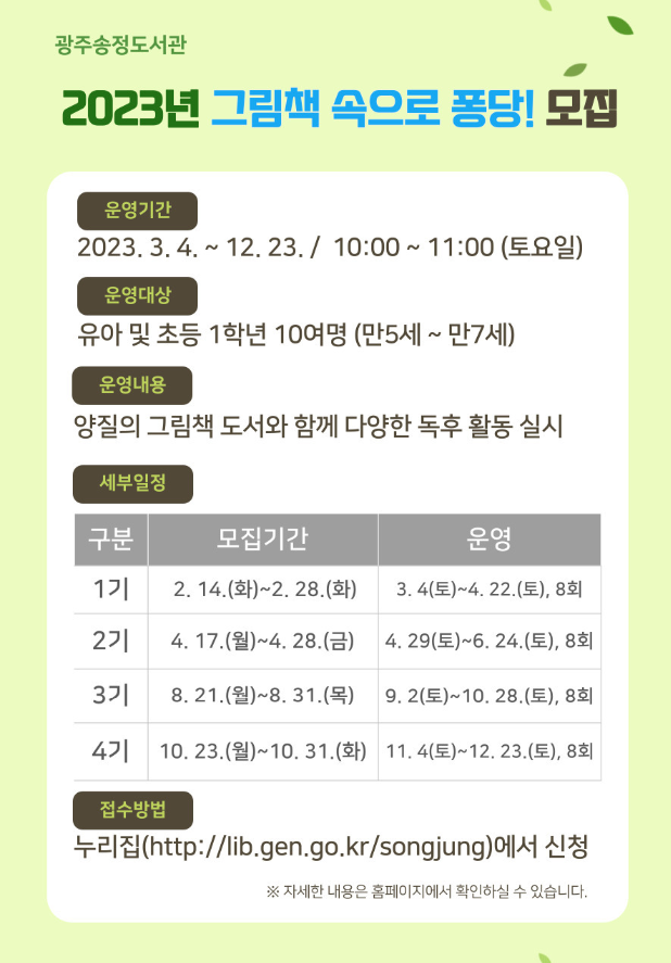 home 맘편한 내★일, 광주아이키움2.0 결혼·임신·출생 영유아 초·중·고 다양한 가족 일생활균형 커뮤니티 아동돌봄지원 소통방 나눔방 광주 아이키움 상담방 돌봄정보방 성폭력 피해 상담 및 사건지원 공지사항 우리동네 돌봄정보 기관별 공지사항 2023년 독서프로그램(그림책속으로 퐁당, 영어랑동화랑) 모집안내 등록일 : 2023-01-18 00:00 카테고리 : 카테고리 없음 작성자 : 운영자 조회수 : 365 [광주송정도서관] 2023년 영어랑 동화랑 모집 양질의 그림책 도서와 함께 다양한 독후 활동을 할 유아 및 초등 1학년 친구들을 모집합니다. 운영기간 2023. 3.4 ~ 12.23 (10시/11시)운영대상 유아 및 초등 1학년 10여명 (만5세~만7세)운영내용 그림책 도서와 함께 다양한 독후 활동 실시 목록