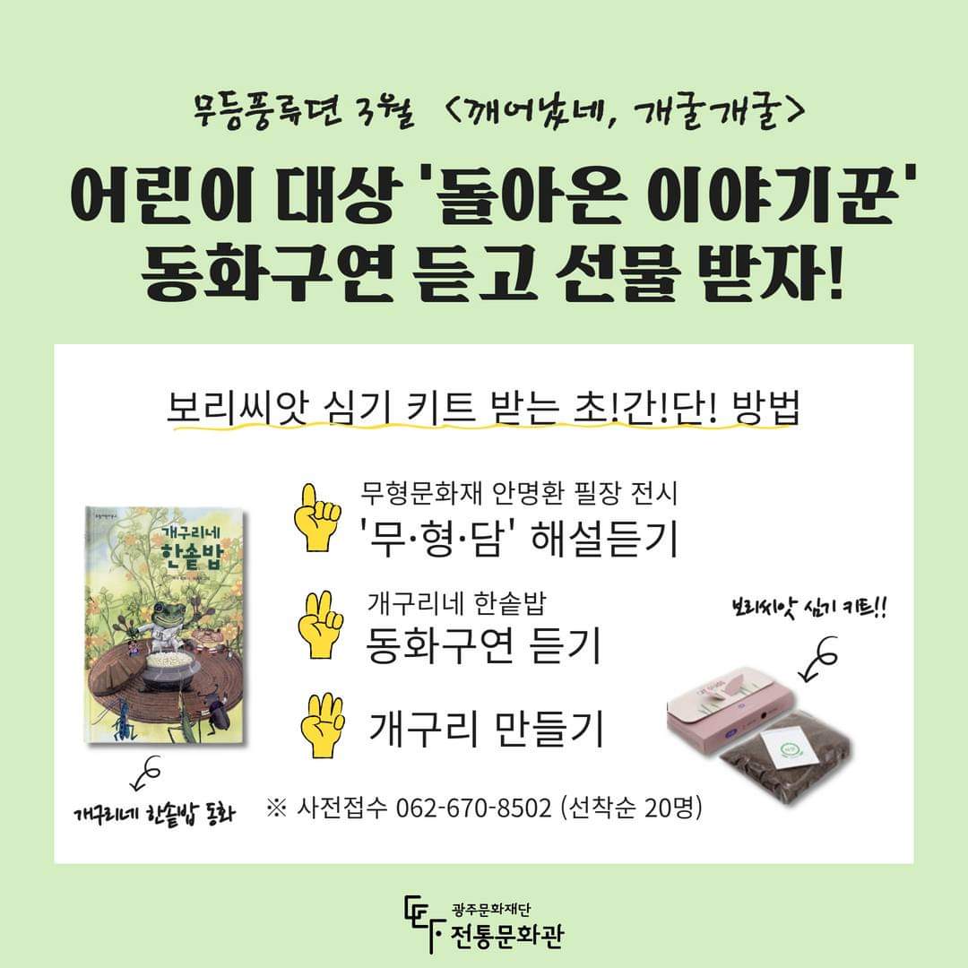 아이들은 1) 무 형 담 해설과 2) 개구리네 한솥밥 동화구연을 듣고 3) 개구리 만들기 체험까지 즐기면 " 보리씨앗 심기 키트" 를 받을 수 있어요