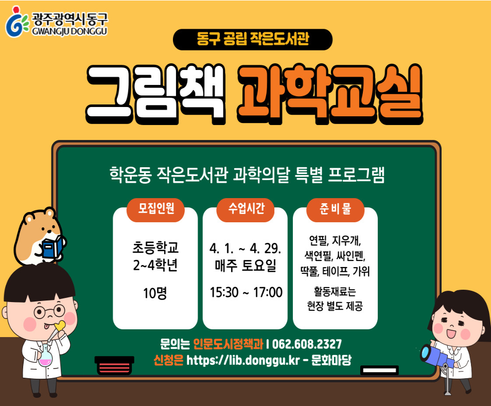 - 장소 : 학운동 작은도서관(동구 의재로43번길 27-3, 동구 청소년수련관 20층)