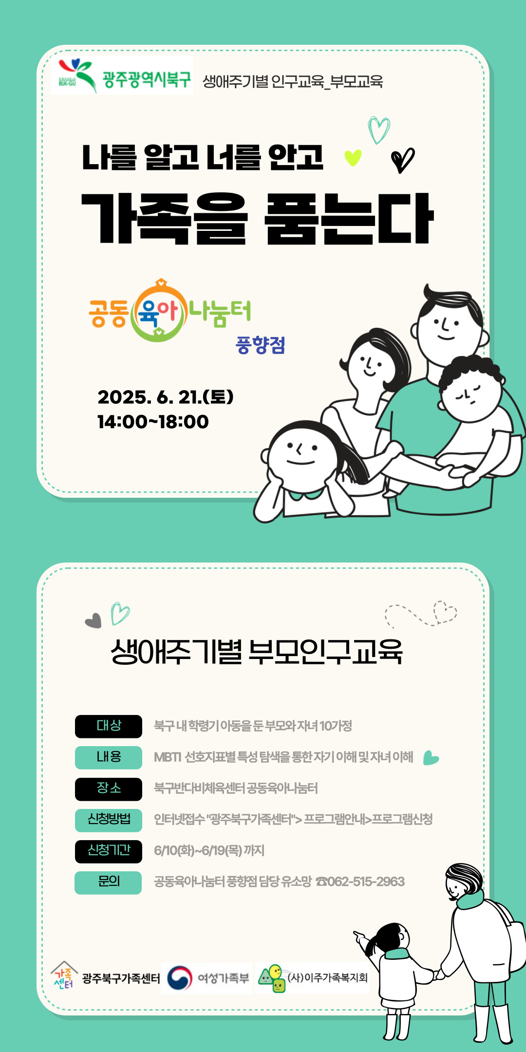 home 맘편한 내★일, 광주아이키움2.0 결혼·임신·출생 영유아 초·중·고 다양한 가족 일생활균형 커뮤니티 아동돌봄지원 소통방 나눔방 광주 아이키움 상담방 돌봄정보방 성폭력 피해 상담 및 사건지원 공지사항 우리동네 돌봄정보 기관별 공지사항 [광주북구가족센터] 공동육아나눔터(풍향)_부모교육_나를 알고 너를 안고 가족을 품는다 등록일 : 2025-06-11 10:34 카테고리 : 카테고리 없음 작성자 : 북구가족센터 조회수 : 57 ※ 북구반다비체육센터는 주차료가 발생됨을 안내드립니다. 목록