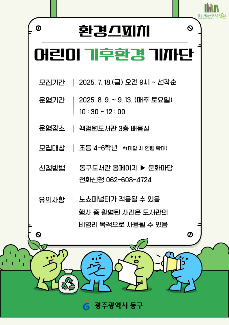 home 맘편한 내★일, 광주아이키움2.0 결혼·임신·출생 영유아 초·중·고 다양한 가족 일생활균형 커뮤니티 아동돌봄지원 소통방 나눔방 광주 아이키움 상담방 돌봄정보방 성폭력 피해 상담 및 사건지원 공지사항 우리동네 돌봄정보 기관별 공지사항 [동구구립도서관] 어린이 기후환경 기자단 등록일 : 2025-08-12 14:05 카테고리 : 카테고리 없음 작성자 : 운영자 조회수 : 32 [출처 : 광주광역시 동구 구립 도서관]연령확대!3학년도 신청 가능합니다.모집 미달 시 추후 연령층을 확대할 수 있습니다. 노쇼 패널티가 적용될 수 있으며, 행사 중 촬영된 사진은 도서관의 비영리 목적으로 사용될 수 있습니다. (신청 시 동의로 간주) 목록