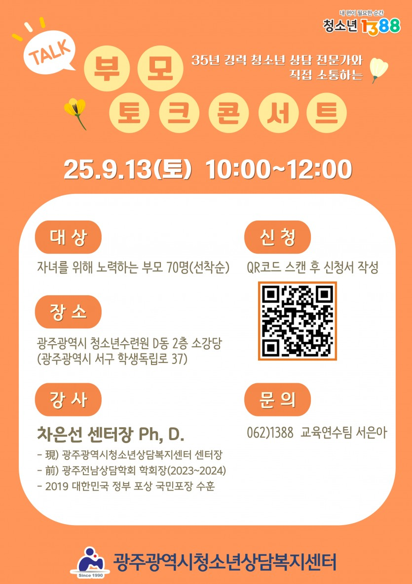 home 맘편한 내★일, 광주아이키움2.0 결혼·임신·출생 영유아 초·중·고 다양한 가족 일생활균형 커뮤니티 아동돌봄지원 소통방 나눔방 광주 아이키움 상담방 돌봄정보방 성폭력 피해 상담 및 사건지원 공지사항 우리동네 돌봄정보 기관별 공지사항 [광주광역시청소년상담복지센터] 부모 토크콘서트 등록일 : 2025-08-20 14:47 카테고리 : 카테고리 없음 작성자 : 운영자 조회수 : 30 [출처 : 광주광역시청소년상담복지센터] 목록