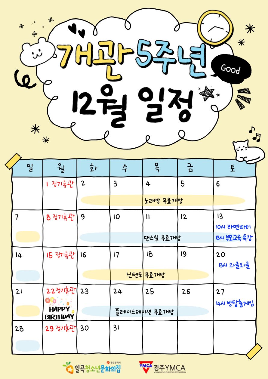 home 맘편한 내★일, 광주아이키움2.0 결혼·임신·출생 영유아 초·중·고 다양한 가족 일생활균형 커뮤니티 아동돌봄지원 소통방 나눔방 광주 아이키움 상담방 돌봄정보방 성폭력 피해 상담 및 사건지원 공지사항 우리동네 돌봄정보 기관별 공지사항 [일곡청소년문화의집]개관 5주년 기념행사 안내 등록일 : 2025-12-10 11:02 카테고리 : 카테고리 없음 작성자 : 운영자 조회수 : 30 아이도! 어른도! 주민도! 12월은 당근센터에서 다 같이 신나게! 개관 5주년 기념 한 달 축제 🥳 🎁 테마별 무료이용 🎁 운영위원회 라면파티 🎁 청소년 축하콘서트 ‘와글와글’ 🎁 이승훈 작가 부모교육 특강까지! 누구나 참여 가능합니다💛 출처:일곡청소년문화의집 목록