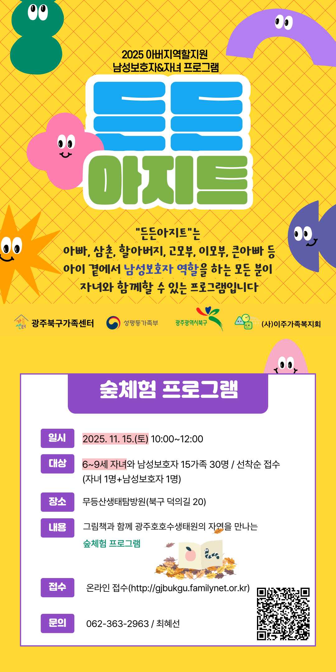자연 속에서 놀이와 체험을 통해 서로를 이해하고 소통하며, 일상에서 쉽게 경험하기 어려운 돌봄과 양육의 즐거움을 느낄 수 있는 시간입니다.