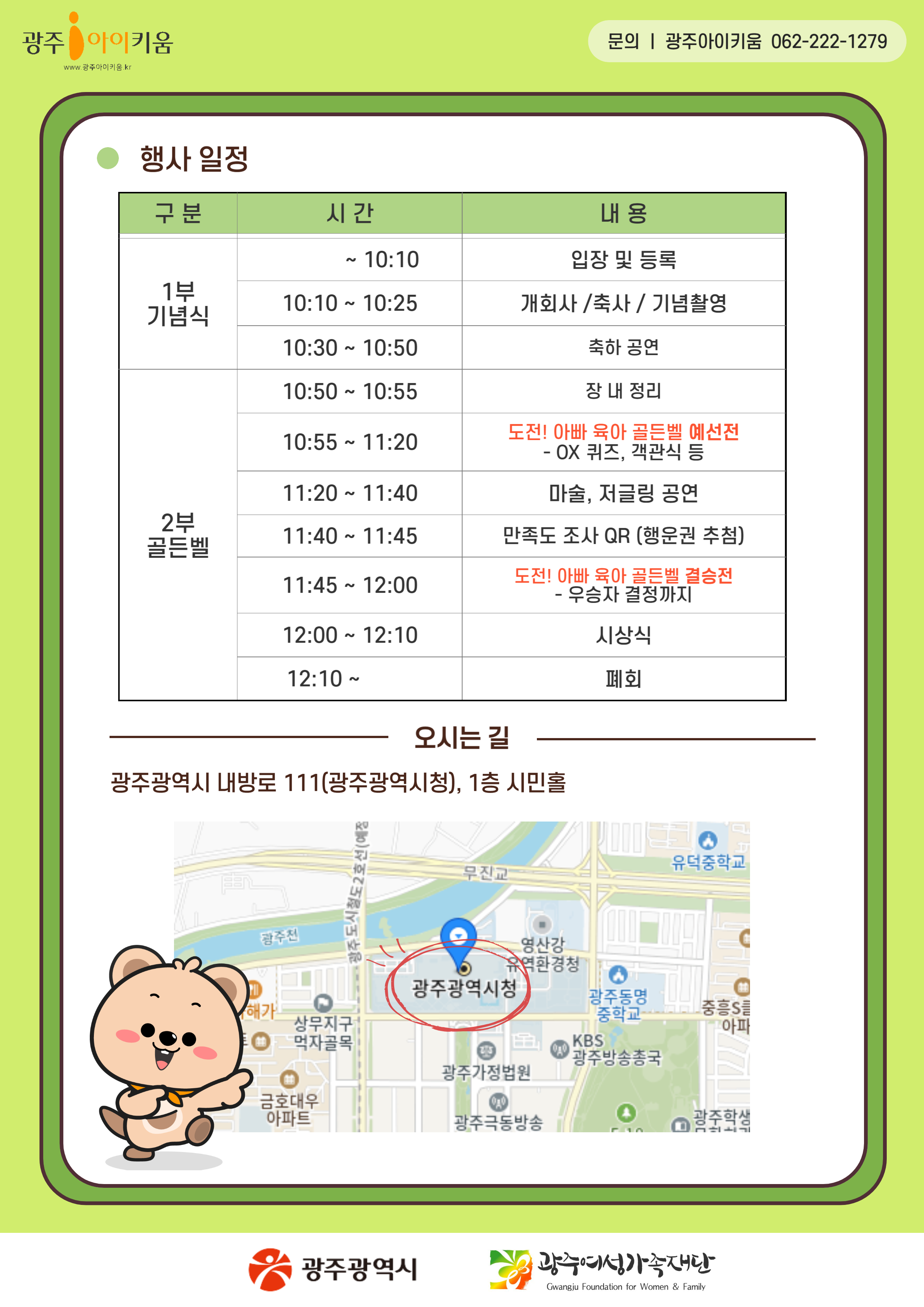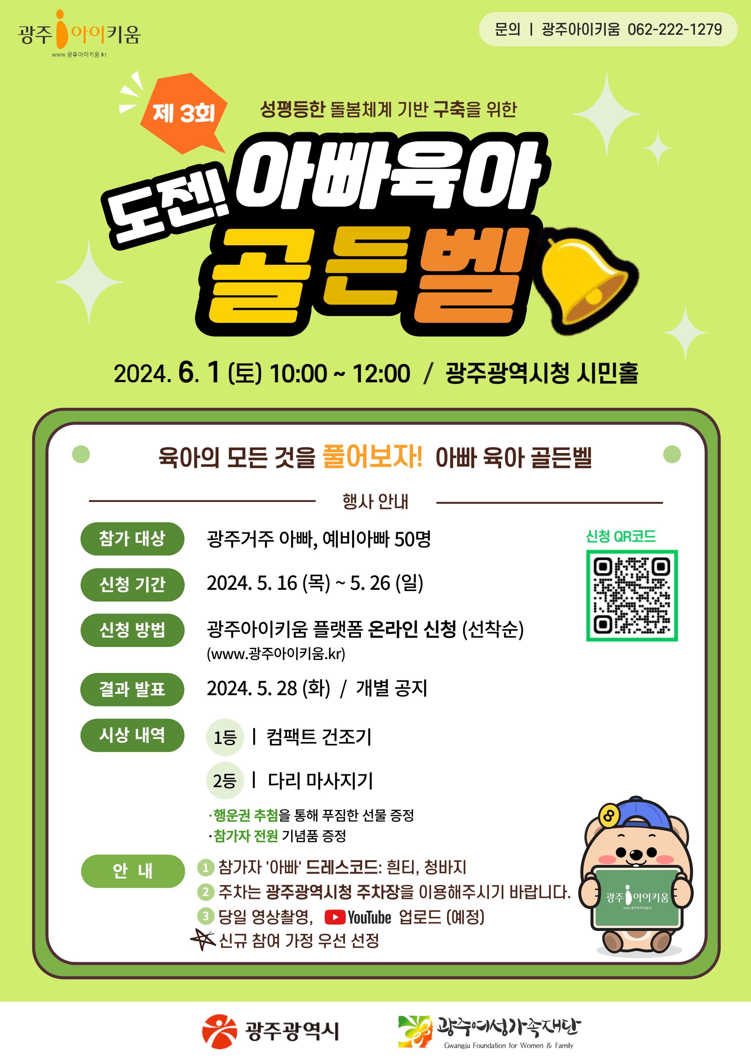 성평등한 돌봄체계 기반 구축을 위한 '제3회 도전! 아빠육아골든벨'이 6월 1일 광주 시청에서 개최됩니다.