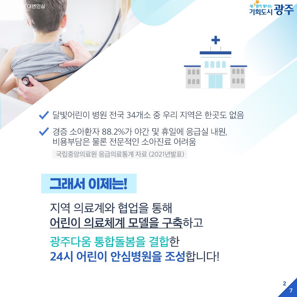 광주광역시는 소아청소년병원 오픈런이 빚어지는 진료대란과 소아청소년과 폐과 위기에 부모들의 애가 타는 현실을 고려해 지역 의료계와 협업을 통해