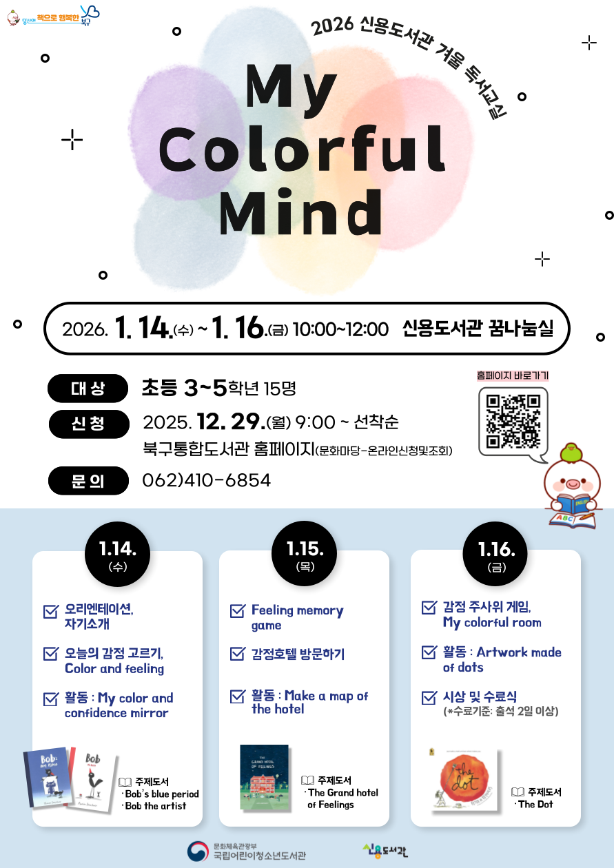 home 맘편한 내★일, 광주아이키움2.0 결혼·임신·출생 영유아 초·중·고 다양한 가족 일생활균형 커뮤니티 아동돌봄지원 소통방 나눔방 광주 아이키움 상담방 돌봄정보방 성폭력 피해 상담 및 사건지원 공지사항 우리동네 돌봄정보 기관별 공지사항 [신용도서관]영어 독서교실 'My Colorful Mind' 등록일 : 2025-12-24 09:11 카테고리 : 카테고리 없음 작성자 : 운영자 조회수 : 66 출처:광주북구통합도서관 목록