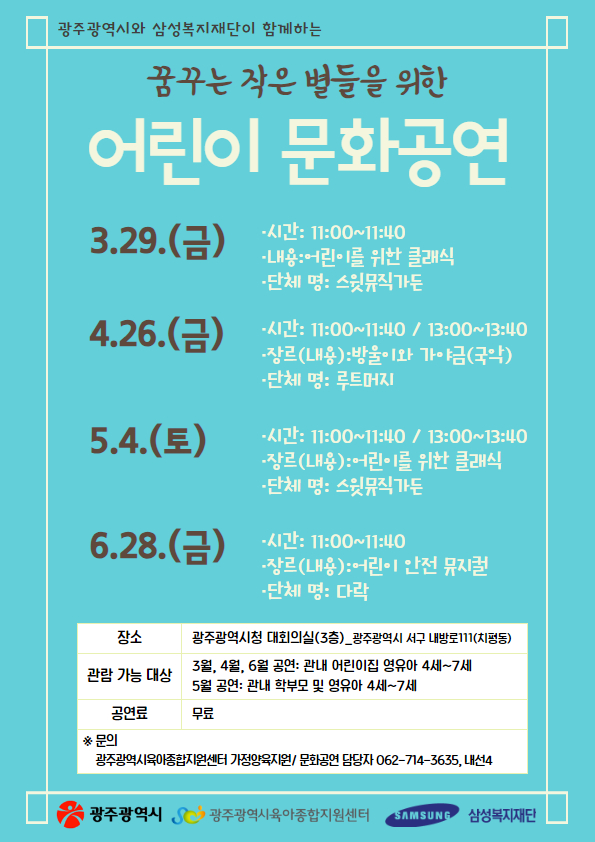 ○공연 관람 대상은? 3월, 4월, 6월: 관내 어린이집 영유아(4~7세) 5월: 지역 학부모 및 영유아(4세~7세) 📢 5월 공연 신청은 광주육아종합지원센터에서 사전 신청 접수 예정입니다. 조금만 기다려 주세요~ ○관람료가 있나요? 무료 관람으로 즐겨보세요~ ○문의는 어디로? 광주광역시육아종합지원센터 문화공연 담당자 062)714-3635 (내선4)