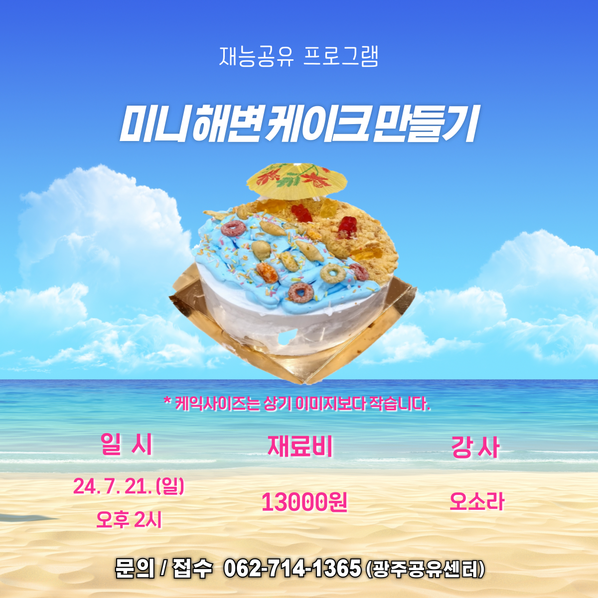 home 맘편한 내★일, 광주아이키움2.0 결혼·임신·출생 영유아 초·중·고 다양한 가족 일생활균형 커뮤니티 아동돌봄지원 소통방 나눔방 광주 아이키움 상담방 돌봄정보방 성폭력 피해 상담 및 사건지원 공지사항 우리동네 돌봄정보 기관별 공지사항 💜[공유센터] 재능공유 주말프로그램💜 등록일 : 2024-07-09 17:27 카테고리 : 카테고리 없음 작성자 : 운영자 조회수 : 243 광주공유센터에서 재능공유프로그램을 진행 합니다!○일시 : 7.20(토) ~ 21(일) 오후2시○내용 : 천연 선크림만들기 / 해변케이크만들기 / 천연모기기피제&버물리 만들기○비용 : 재료에 따라 비용 차이 있음 . (1만원~1.5만원)○문의 : 광주공유센터 062-714-1365 많은 관심과 참여 바랍니다. 😆 목록