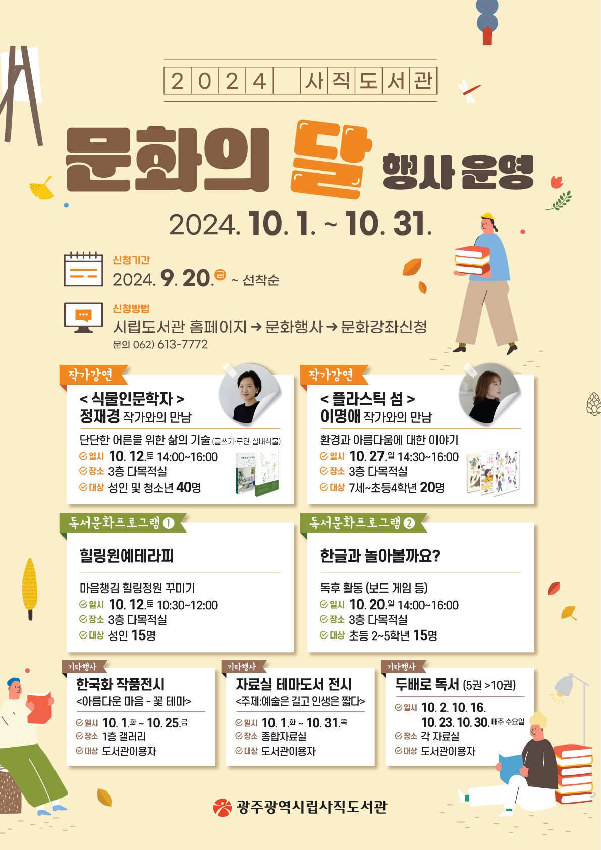 home 맘편한 내★일, 광주아이키움2.0 결혼·임신·출생 영유아 초·중·고 다양한 가족 일생활균형 커뮤니티 아동돌봄지원 소통방 나눔방 광주 아이키움 상담방 돌봄정보방 성폭력 피해 상담 및 사건지원 공지사항 우리동네 돌봄정보 기관별 공지사항 [사직도서관]10월 문화의 달 행사 안내 등록일 : 2024-09-30 09:21 카테고리 : 카테고리 없음 작성자 : 운영자 조회수 : 185 사직도서관에서 운영하는 문화의 달(10월) 행사를 알려드립니다.작가와의 만남, 체험 프로그램(원예테라피, 한글 보드게임), 한국화 전시 등을 운영합니다.[출처 : 광주광역시] 목록