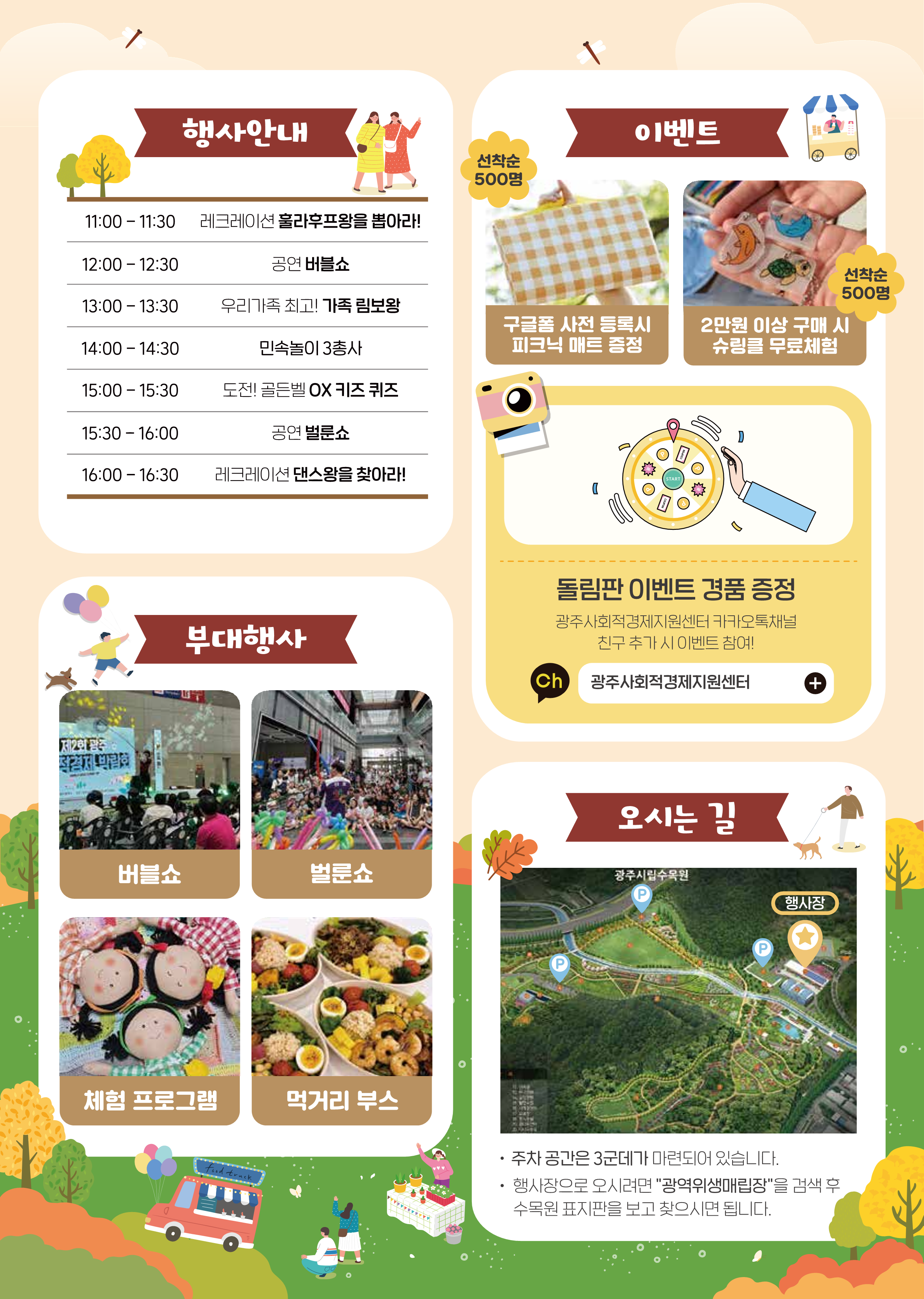 home 맘편한 내★일, 광주아이키움2.0 결혼·임신·출생 영유아 초·중·고 다양한 가족 일생활균형 커뮤니티 아동돌봄지원 소통방 나눔방 광주 아이키움 상담방 돌봄정보방 성폭력 피해 상담 및 사건지원 공지사항 우리동네 돌봄정보 기관별 공지사항 2024년 “하이, 푸릇마켓 in 광주시립수목원” 등록일 : 2024-10-10 15:07 카테고리 : 카테고리 없음 작성자 : 운영자 조회수 : 199 2024년 하반기 사회적경제 지역연계장터 “하이, 푸릇마켓 in 광주시립수목원” 개최를 알려드립니다.❍ 행 사 명 : “하이, 푸릇마켓 in 광주시립수목원”❍ 일 시 : 2024. 10. 12. (토) 11:00 ~ 17:00❍ 장 소 : 광주시립수목원 방문자센터 일원(광주 남구 도동길 142)❍ 주요내용 : 사회적경제 홍보 및 관련 제품·서비스 체험·판매 등 목록