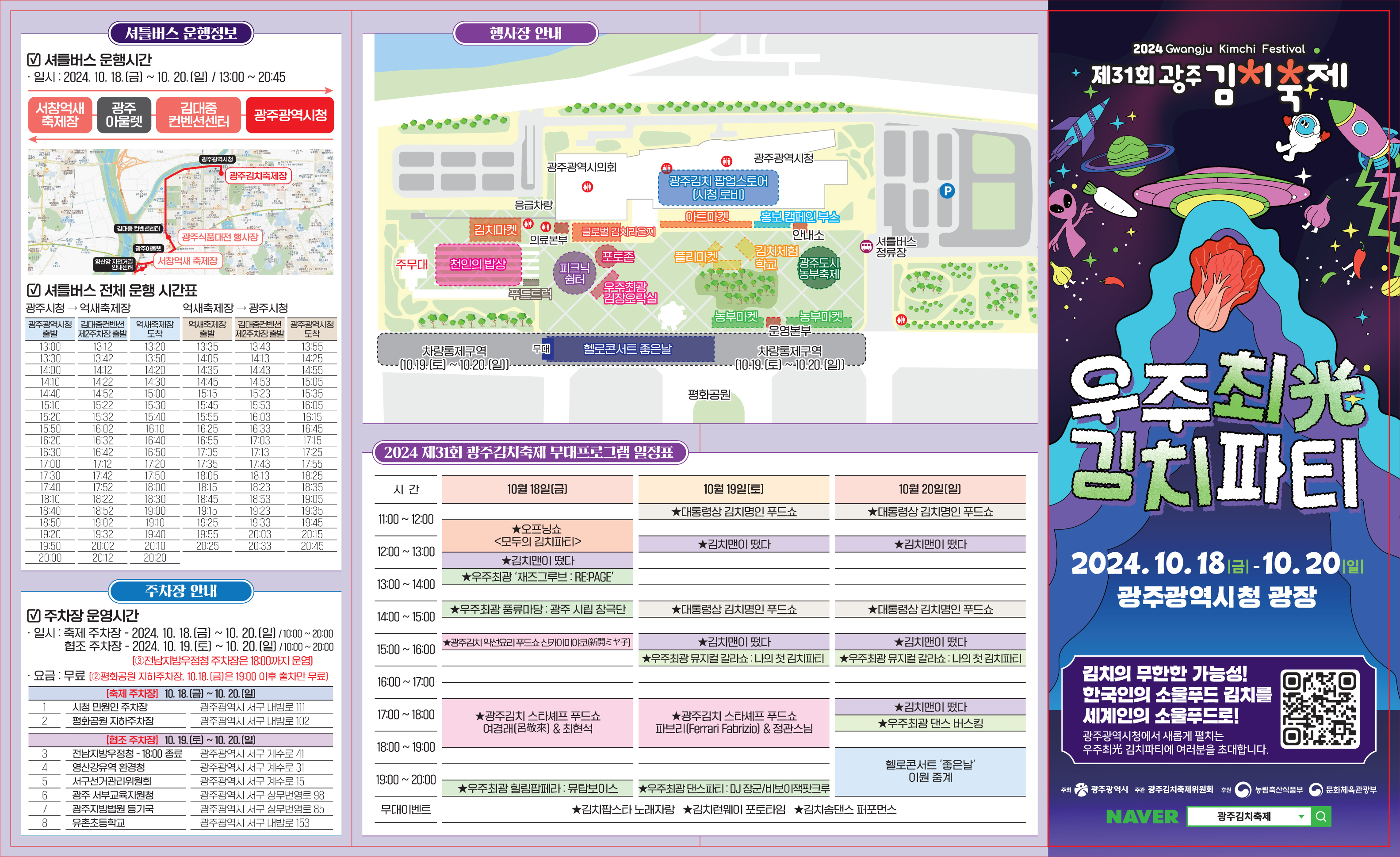 home 맘편한 내★일, 광주아이키움2.0 결혼·임신·출생 영유아 초·중·고 다양한 가족 일생활균형 커뮤니티 아동돌봄지원 소통방 나눔방 광주 아이키움 상담방 돌봄정보방 성폭력 피해 상담 및 사건지원 공지사항 우리동네 돌봄정보 기관별 공지사항 ‘우주최광(光) 김치파티’ 제31회 광주김치축제 열린다! 등록일 : 2024-10-17 08:42 카테고리 : 카테고리 없음 작성자 : 운영자 조회수 : 273 ※ 축제장 공간은 현장 상황에 따라 변동 될 수 있습니다.○ 기간 : 2024. 10. 18.(금) ~ 10. 20.(일)○ 장소 : 광주광역시청 광장 일원○ 내용 : 천인의 밥상, 광주김치 스타셰프 푸드쇼, 대통령상 김치명인 푸드쇼, 김치마켓, 김치체험 등○ 주최/주관 : 광주광역시/광주김치축제위원회○ 문의 : 광주김치축제사무국 062-613-3955~6 목록