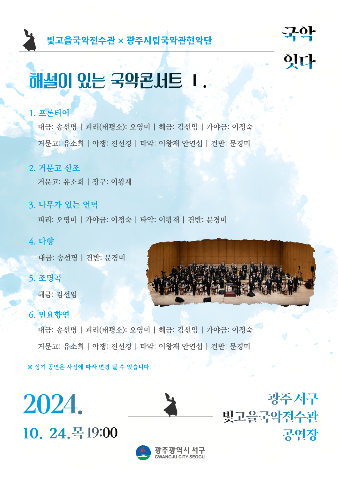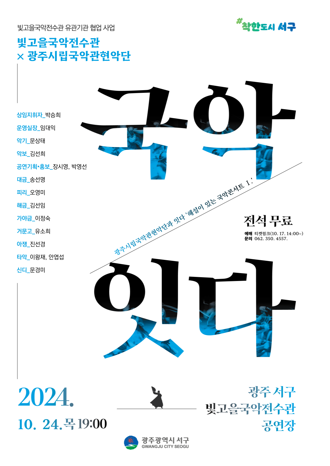 home 맘편한 내★일, 광주아이키움2.0 결혼·임신·출생 영유아 초·중·고 다양한 가족 일생활균형 커뮤니티 아동돌봄지원 소통방 나눔방 광주 아이키움 상담방 돌봄정보방 성폭력 피해 상담 및 사건지원 공지사항 우리동네 돌봄정보 기관별 공지사항 광주시립국악관현악단과 함께하는 해설이 있는 국악콘서트 등록일 : 2024-10-21 17:16 카테고리 : 카테고리 없음 작성자 : 운영자 조회수 : 201 공연명 : 빛고을국악전수관 × 광주시립국악관현악단 '해설이 있는 국악 콘서트 Ⅱ'일 시 - 1회차 : 2024. 10. 24.(목) 19시 - 2회차 : 2024. 11. 14.(목) 19시장 소 : 빛고을국악전수관 공연장관람방법 : 티켓링크(2024. 10. 17. 14시~) 예매문 의 : 062-350-4557<출처 : 서구청> 목록