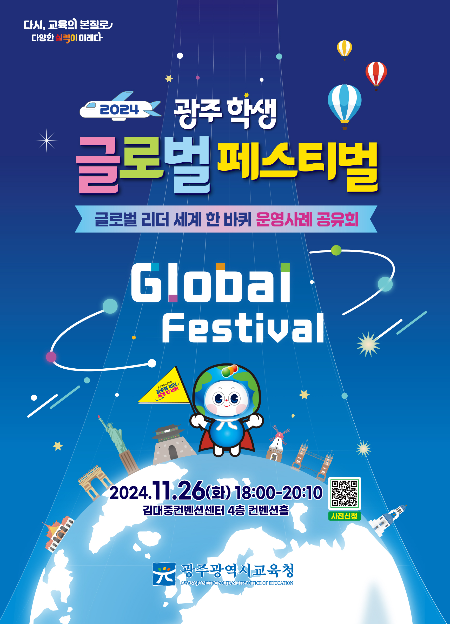 2024 광주 학생 글로벌 페스티벌 참석 및 신청에 대해 안내하오니 관심있는 학생 및 학부모, 교직원은 참여하시기 바랍니다.