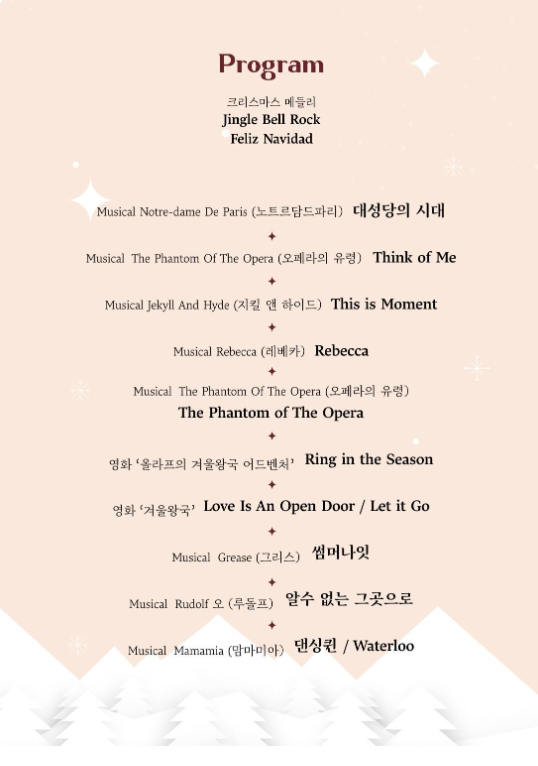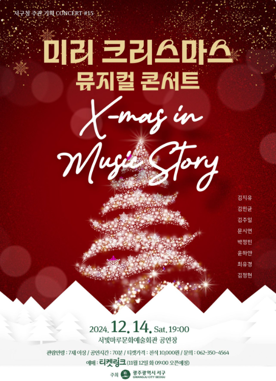 home 맘편한 내★일, 광주아이키움2.0 결혼·임신·출생 영유아 초·중·고 다양한 가족 일생활균형 커뮤니티 아동돌봄지원 소통방 나눔방 광주 아이키움 상담방 돌봄정보방 성폭력 피해 상담 및 사건지원 공지사항 우리동네 돌봄정보 기관별 공지사항 🎄미리크리스마스 뮤지컬 콘서트🎄 등록일 : 2024-11-29 13:56 카테고리 : 카테고리 없음 작성자 : 운영자 조회수 : 239 찬바람과 함께 캐럴이 들려오는 12월 크리스마스 시즌입니다.서구청에서는 미리 크리스마스 뮤지컬 콘서트로 특별한 미리 크리스마스를 준비하고 있습니다.🎄미리크리스마스 뮤지컬 콘서트🎄일 시 : 2024. 12. 14.(토) 19:00장 소 : 서빛마루문화예술회관 공연장이번 크리스마스는 뮤지컬 음악과 함께하세요~!<출처 : 서구청> 목록
