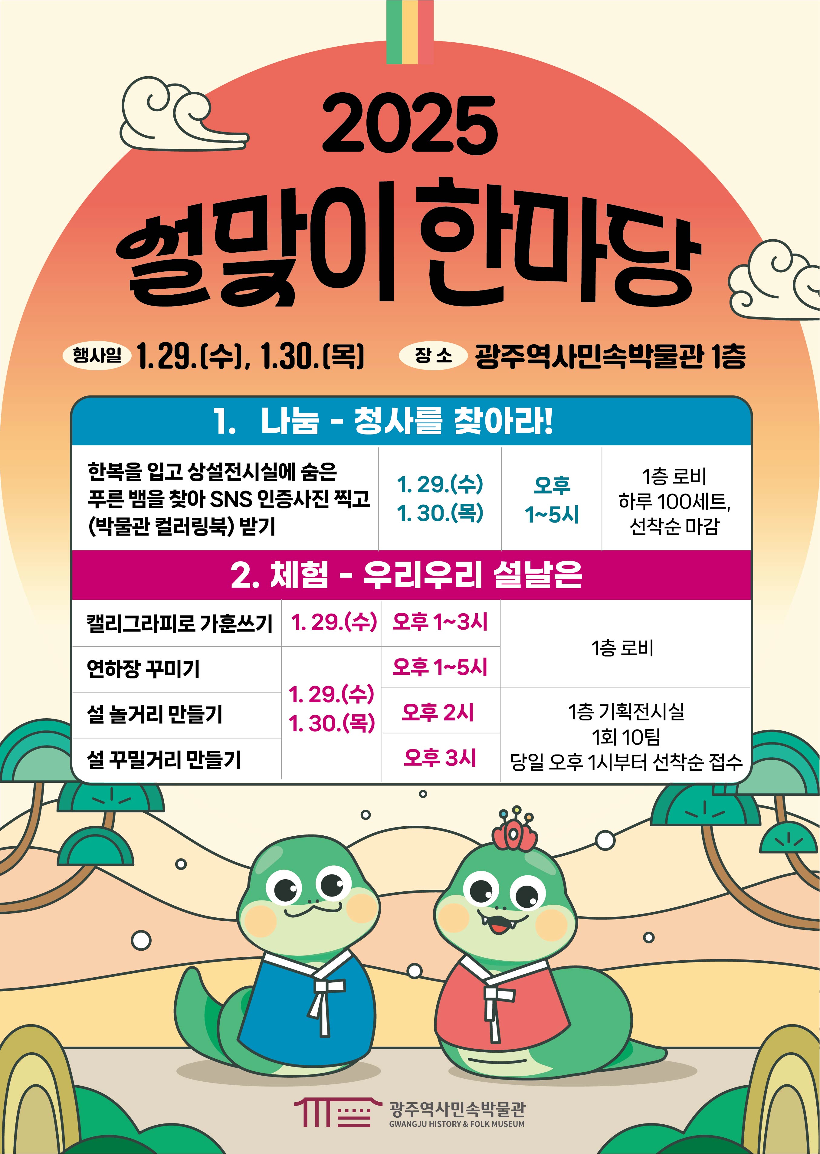 home 맘편한 내★일, 광주아이키움2.0 결혼·임신·출생 영유아 초·중·고 다양한 가족 일생활균형 커뮤니티 아동돌봄지원 소통방 나눔방 광주 아이키움 상담방 돌봄정보방 성폭력 피해 상담 및 사건지원 공지사항 우리동네 돌봄정보 기관별 공지사항 [역사민속박물관] 2025 설맞이 한마당 행사 개최 등록일 : 2025-01-23 11:10 카테고리 : 카테고리 없음 작성자 : 운영자 조회수 : 147 광주역사민속박물관에서 2025 설맞이 한마당을 개최합니다!행사일 : 1/29(수), 1/30(목) 장소 : 광주역사민속박물관 1층문의 : 학예연구실 613-5361 목록