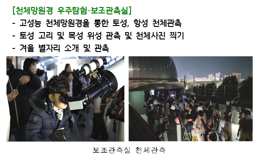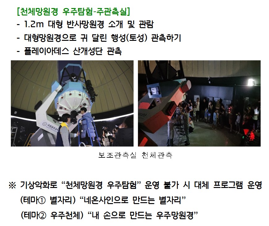 - 기상 악화로 천체 관측이 어려울 경우, 천체 관측 대신 상기 안내 된 대체 프로그램을 운영합니다.
