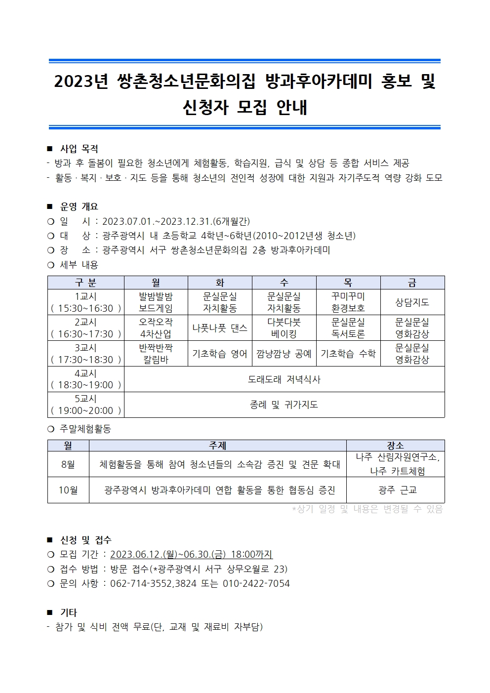home 맘편한 내★일, 광주아이키움2.0 결혼·임신·출생 영유아 초·중·고 다양한 가족 일생활균형 커뮤니티 아동돌봄지원 소통방 나눔방 광주 아이키움 상담방 돌봄정보방 성폭력 피해 상담 및 사건지원 공지사항 우리동네 돌봄정보 기관별 공지사항 [쌍촌청소년문화의집] 2023년 청소년방과후아카데미 신입생 모집(초등 4~6학년) 등록일 : 2023-06-22 17:54 카테고리 : 카테고리 없음 작성자 : 광주광역시 청소년활동진흥센터 조회수 : 355 목록