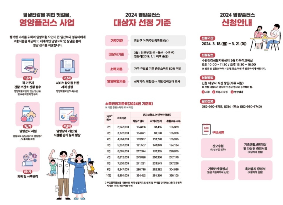 home 맘편한 내★일, 광주아이키움2.0 결혼·임신·출생 영유아 초·중·고 다양한 가족 일생활균형 커뮤니티 아동돌봄지원 소통방 나눔방 광주 아이키움 상담방 돌봄정보방 성폭력 피해 상담 및 사건지원 공지사항 우리동네 돌봄정보 기관별 공지사항 광산구 👶영양플러스 대상자 모집👪 등록일 : 2024-02-28 16:57 카테고리 : 카테고리 없음 작성자 : 운영자 조회수 : 366 광산구에서 임산부와 영유아 건강을 위한영양플러스 대상자를 모집합니다.행복한 미래를 위하여 영앙위험요인이 큰 임산부와 영유아에게 보충식품을 제공하고 체계적인 영양교육 및 상담을 통해 영양 관리를 지원합니다.<출처:광산구청블로그> 목록