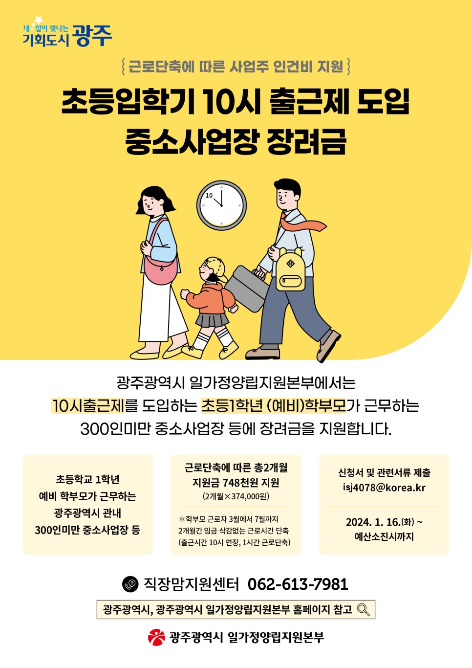 home 맘편한 내★일, 광주아이키움2.0 결혼·임신·출생 영유아 초·중·고 다양한 가족 일생활균형 커뮤니티 아동돌봄지원 소통방 나눔방 광주 아이키움 상담방 돌봄정보방 성폭력 피해 상담 및 사건지원 공지사항 우리동네 돌봄정보 기관별 공지사항 💰초등입학기 10시 출근제 도입 중소사업장 장려금 지원! 등록일 : 2024-03-15 16:15 카테고리 : 카테고리 없음 작성자 : 운영자 조회수 : 272 문의사항 : ☎️062-613-7981(일가정양립지원본부 직장맘지원센터)[출처] 💰초등입학기 10시 출근제 도입 중소사업장 장려금 지원!|작성자 광주북구청 목록