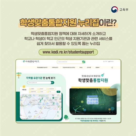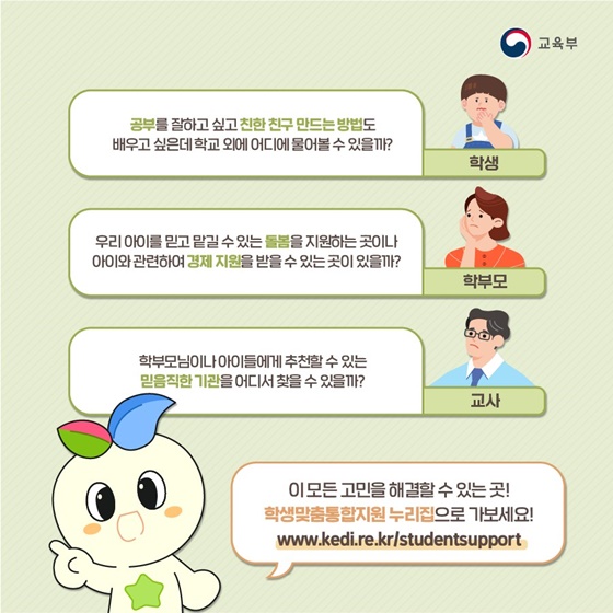 home 맘편한 내★일, 광주아이키움2.0 결혼·임신·출생 영유아 초·중·고 다양한 가족 일생활균형 커뮤니티 아동돌봄지원 소통방 나눔방 광주 아이키움 상담방 돌봄정보방 성폭력 피해 상담 및 사건지원 공지사항 우리동네 돌봄정보 기관별 공지사항 [교육부] 학생맞춤 통합지원 누리집! 등록일 : 2024-05-22 10:48 카테고리 : 카테고리 없음 작성자 : 운영자 조회수 : 229 학생, 학부모, 교사들은 주목해주세요~~~!!!우리 학교 학교 주변에 있는 아이들을 위한 서비스를 한눈에! 알아볼 수 있는 '학생맞춤통합지원 누리집'을 소개합니다!학생들에게 필요한 서비스를 빠르고 쉽게 찾아보세요! 목록