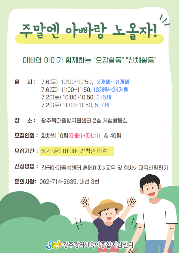 home 맘편한 내★일, 광주아이키움2.0 결혼·임신·출생 영유아 초·중·고 다양한 가족 일생활균형 커뮤니티 아동돌봄지원 소통방 나눔방 광주 아이키움 상담방 돌봄정보방 성폭력 피해 상담 및 사건지원 공지사항 우리동네 돌봄정보 기관별 공지사항 [키움뜰 부모교육] 주말엔 아빠랑 노올자! 등록일 : 2024-06-24 10:35 카테고리 : 카테고리 없음 작성자 : 운영자 조회수 : 226 목록
