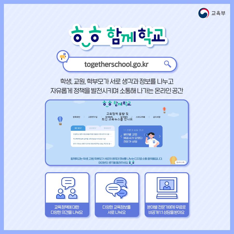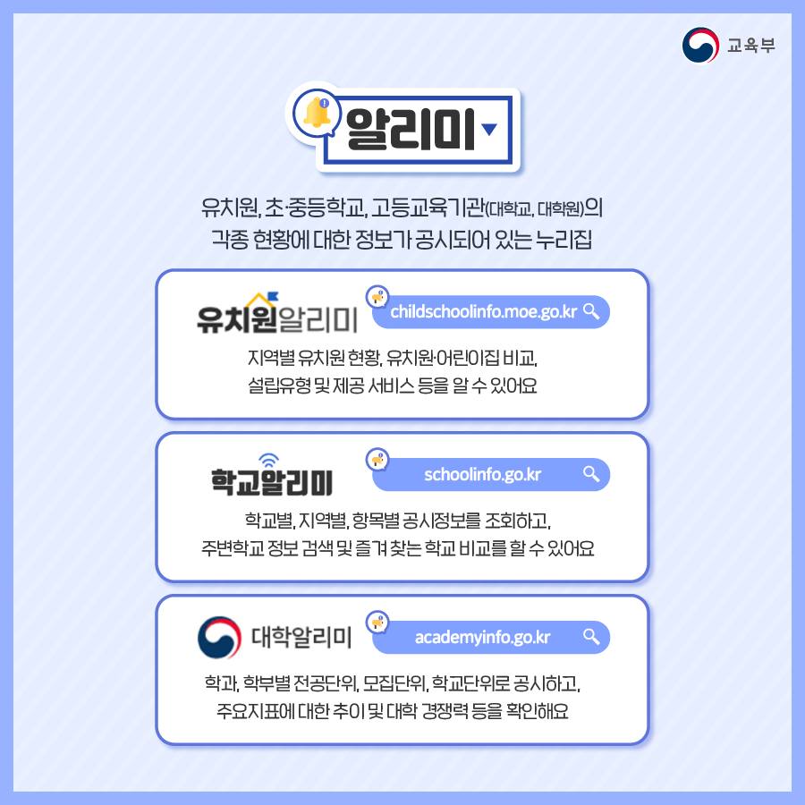 home 맘편한 내★일, 광주아이키움2.0 결혼·임신·출생 영유아 초·중·고 다양한 가족 일생활균형 커뮤니티 아동돌봄지원 소통방 나눔방 광주 아이키움 상담방 돌봄정보방 성폭력 피해 상담 및 사건지원 공지사항 우리동네 돌봄정보 기관별 공지사항 학부모가 알아두면 좋은 유용한 교육정보 누리집! 등록일 : 2024-07-09 13:06 카테고리 : 카테고리 없음 작성자 : 운영자 조회수 : 189 학부모가 알아두면 좋은 유용한 교육정보 누리집!우리 아이 교육에 대한 다양한 정보 꼼꼼하게 확인하고, 궁금증 해결하세요! <출처> 교육부 목록
