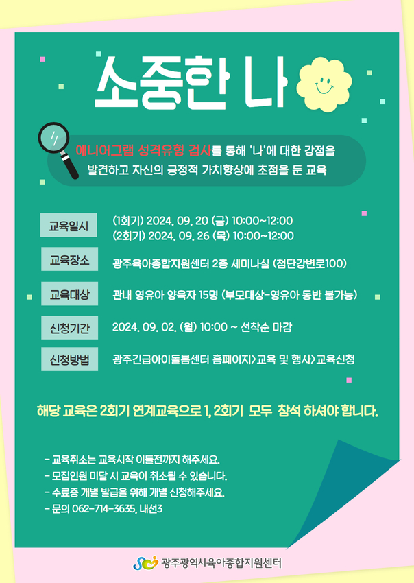 home 맘편한 내★일, 광주아이키움2.0 결혼·임신·출생 영유아 초·중·고 다양한 가족 일생활균형 커뮤니티 아동돌봄지원 소통방 나눔방 광주 아이키움 상담방 돌봄정보방 성폭력 피해 상담 및 사건지원 공지사항 우리동네 돌봄정보 기관별 공지사항 [클로버부모교육] 소중한 나 등록일 : 2024-08-10 00:00 카테고리 : 카테고리 없음 작성자 : 운영자 조회수 : 192 소중한 나.jpg 다운로드 목록