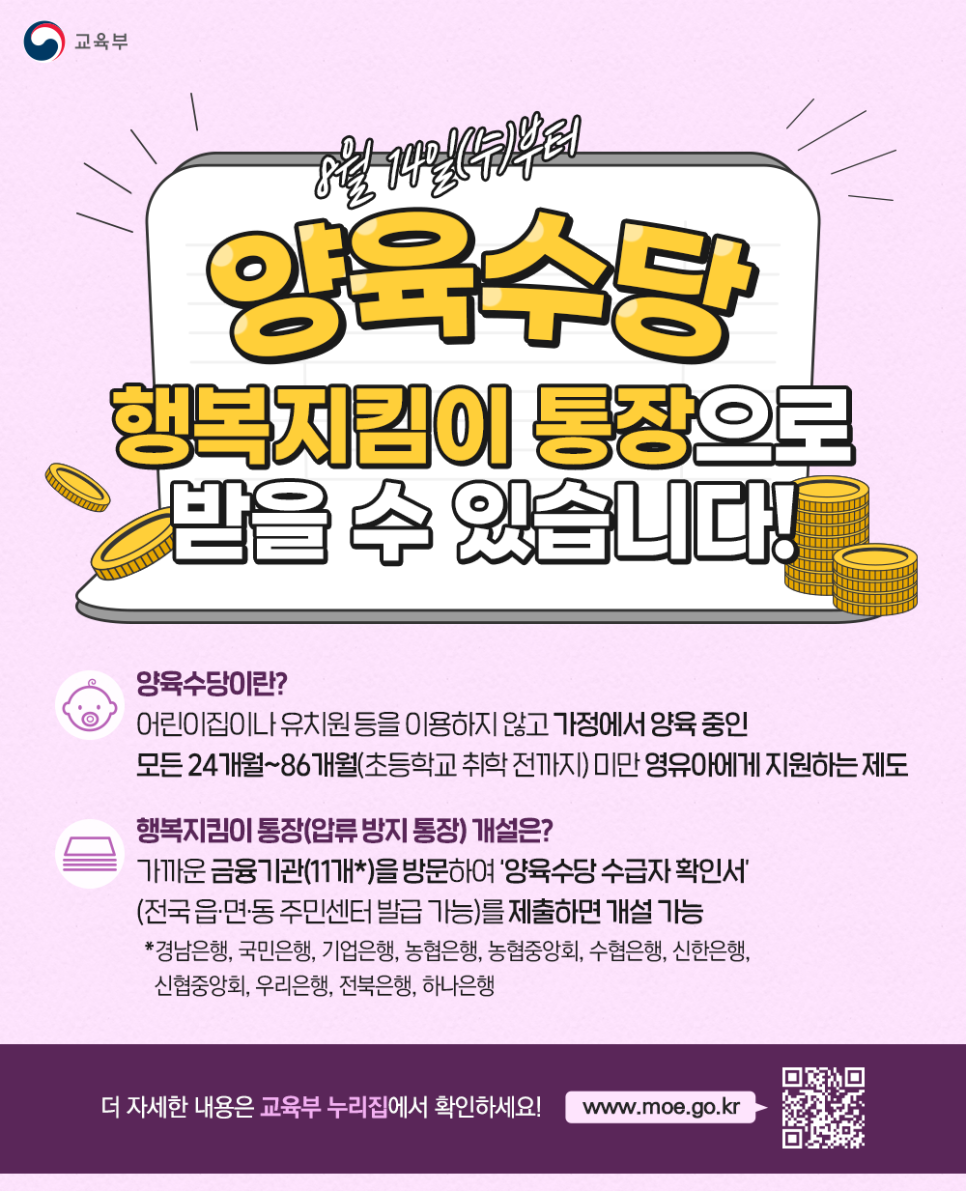 8월 14일(수)부터 양육수당 행복지킴이 통장으로 받을 수 있습니다!