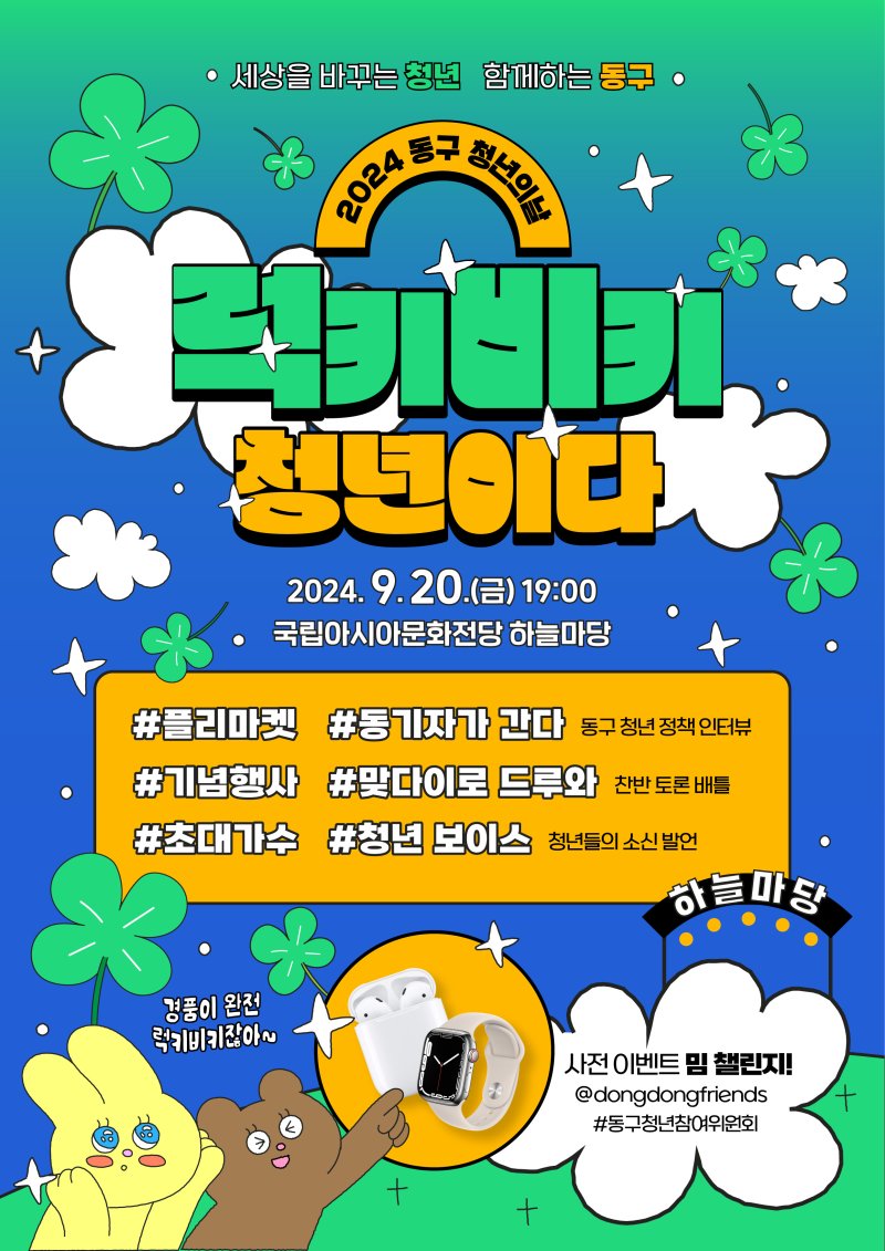 청년의 날을 기념하여 청년들이 주도하고 참여하는 청년축제 「2024년 동구 청년의 날 “럭키비키 청년이다”」를 개최합니다.