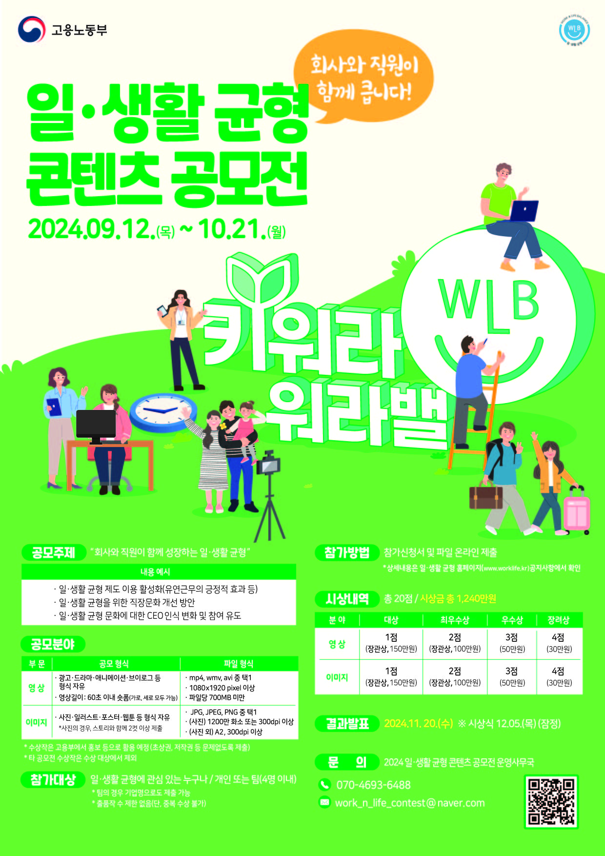 「키워라 워라밸! 2024년 일‧생활 균형 콘텐츠 공모전」을 다음과 같이 개최합니다.