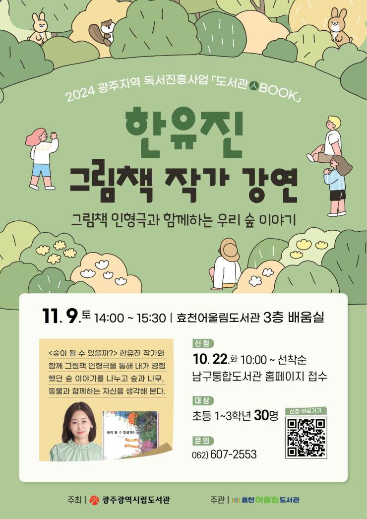home 맘편한 내★일, 광주아이키움2.0 결혼·임신·출생 영유아 초·중·고 다양한 가족 일생활균형 커뮤니티 아동돌봄지원 소통방 나눔방 광주 아이키움 상담방 돌봄정보방 성폭력 피해 상담 및 사건지원 공지사항 우리동네 돌봄정보 기관별 공지사항 [강의]효천어울림도서관 2024년 광주지역 독서진흥사업 「도서관·人·BOOK」 등록일 : 2024-10-24 10:33 카테고리 : 카테고리 없음 작성자 : 운영자 조회수 : 170 ○ 일 시 : 2024. 11. 9.(토) 14:00~15:30○ 대 상 : 초등 1~3학년 30명○ 운영내용- <숲이 될 수 있을까?> 그림책 인형극- 그림책의 배경이 된 제주도 숲 이야기- 숲에서 본 동식물에 관한 의성어, 의태어 말놀이(퀴즈)- 멸종위기동물 이야기(초성퀴즈)- 그림책과 관련된 독후활동[출처 : 광주광역시 남구] 목록