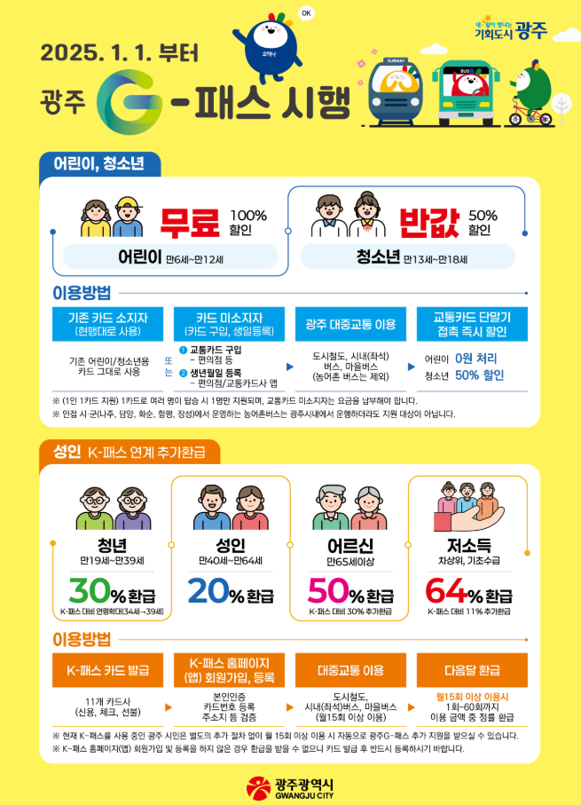광주광역시(시장 강기정)는 2025년부터 시내버스·마을버스·도시철도 등 대중교통 요금을 어린이 무료, 청소년 반값으로 할인하고,